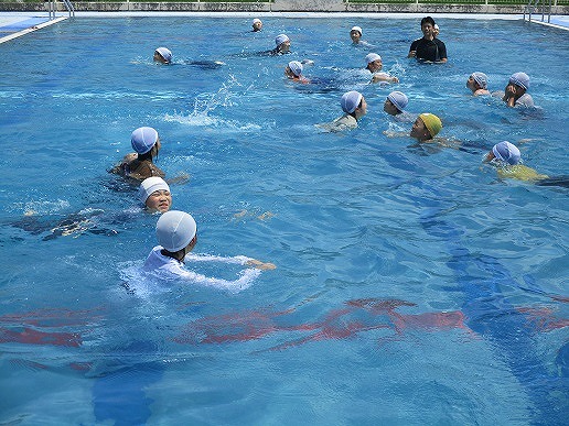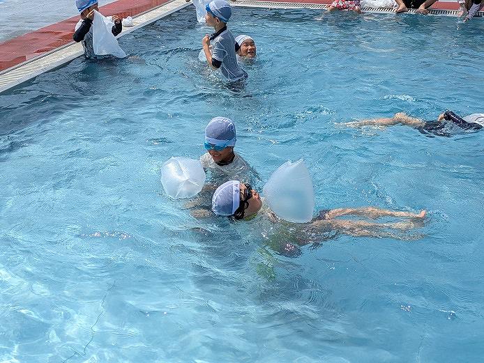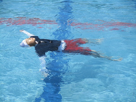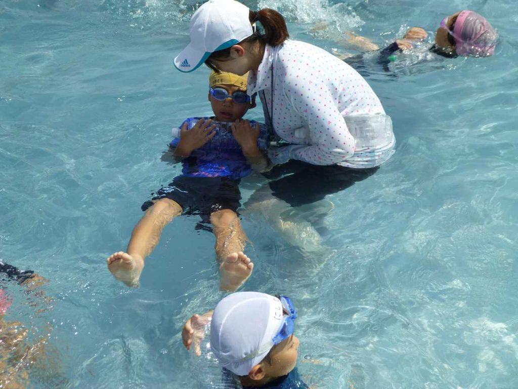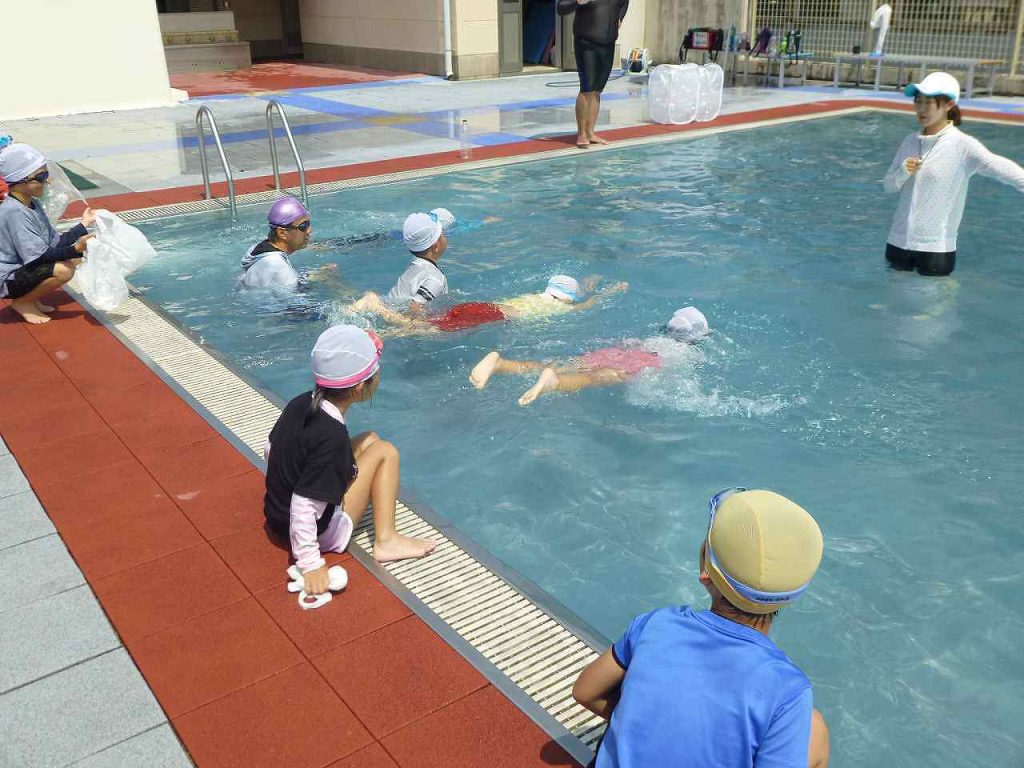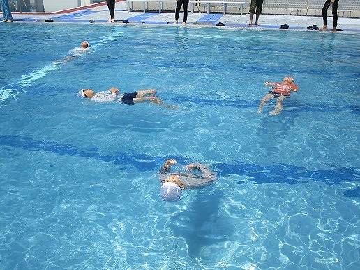 「浮いて待て」の合言葉のもと、ペットボトルなどの道具を使った浮き方や背浮きの方法を学びました。