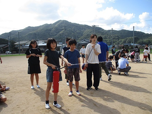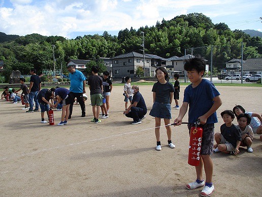 避難後は、全員が水の出る消火器を使って消火体験も行い、実際の対応について学ぶことができました。