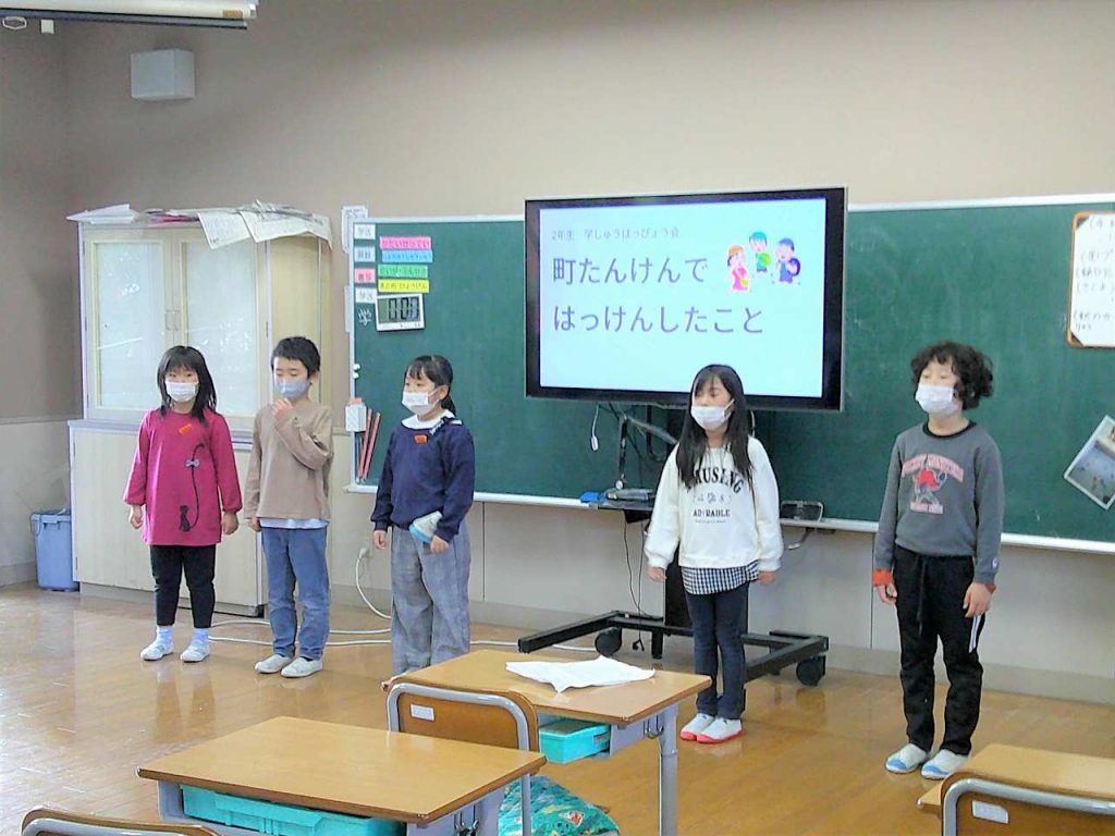 ゆっくり、はっきり、大きな声で話すことを意識し、動作も加えながら表現しています。 舞台の背景づくりにも力を入れ、見ている人にしっかり伝わるように工夫しながら練習を重ねています。
