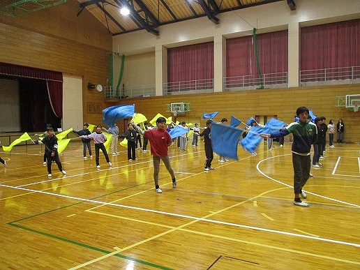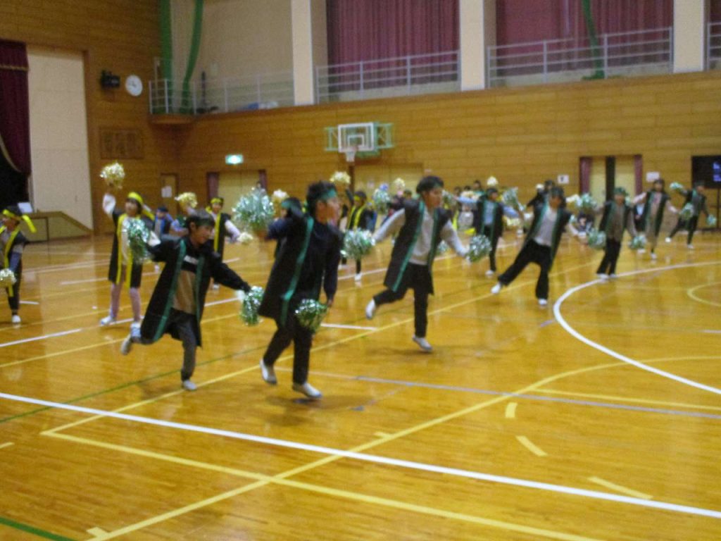 出石特別支援学校からは、朝の運動として取り入れている「秘伝ラーメン体操」が紹介され、伊佐小学校の全校生と一緒に元気いっぱい踊りました。この体操、伊佐小学校でも流行りそうな予感です。