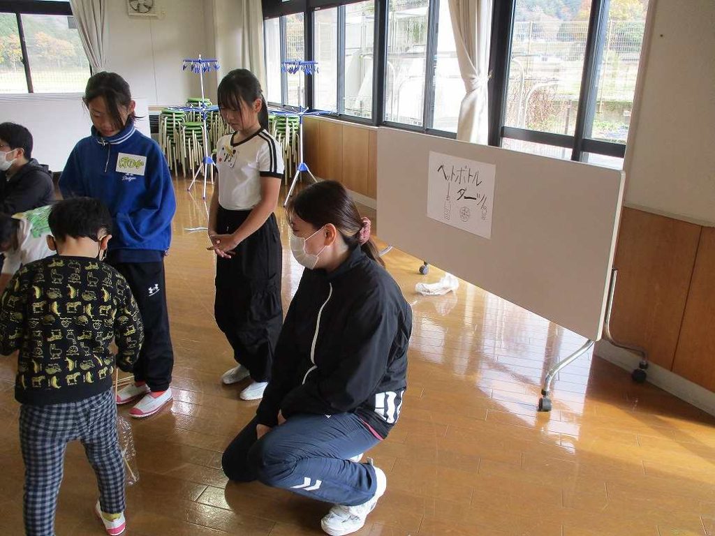 前半は、伊佐小学校の4年生との交流です。まずはお互いに自己紹介をし、その後、4年生が準備してくれた、クイズや遊びブースでに楽しく遊びました。