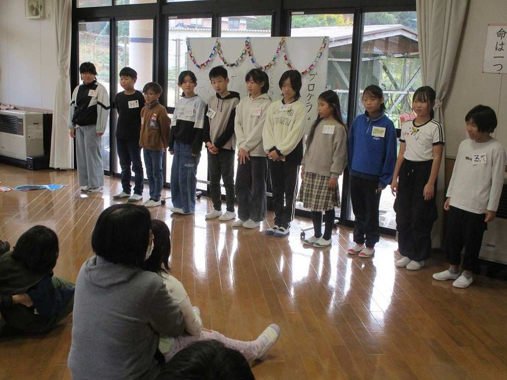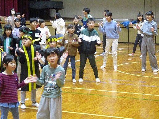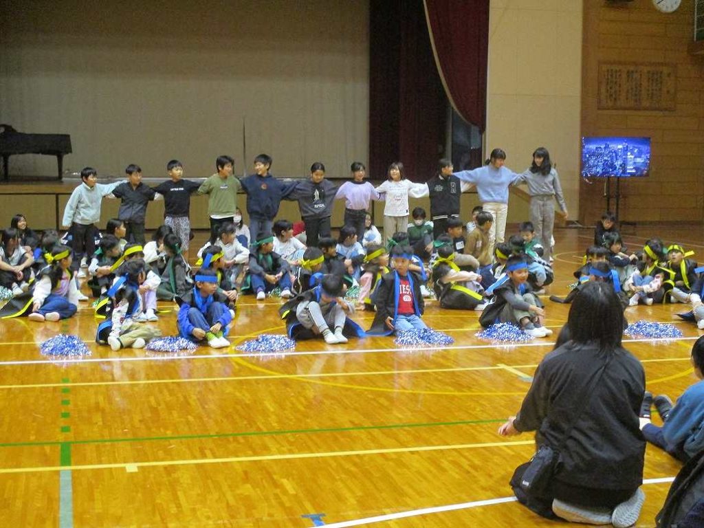 後半は体育館に移動し、伊佐小学校の全校生との交流を行いました。
