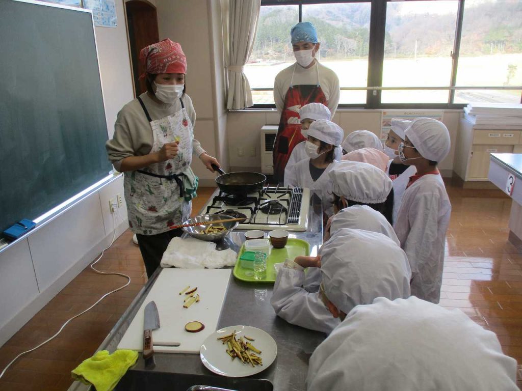給食センターの奥山栄養教諭に来ていただき、さつまいもクッキングを行いました。