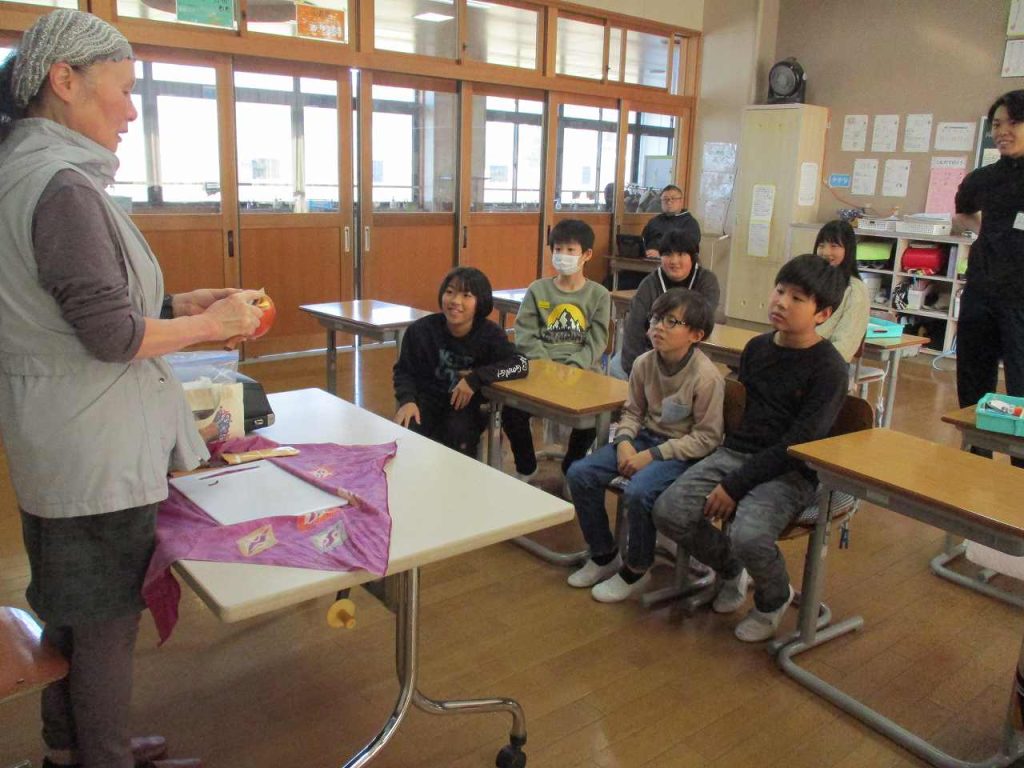 その方は、小学3年生のころから視力がだんだんと弱くなり、今では目が見えないそうです。子どもたちは、そんな中でも包丁を使ってリンゴやキュウリを手際よく切る姿に、とても驚いていました。