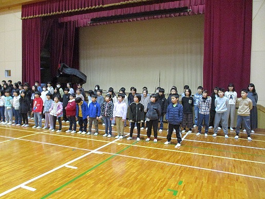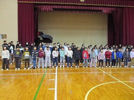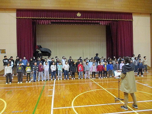 参観日に向けて、全校合唱の練習を体育館で行いました。