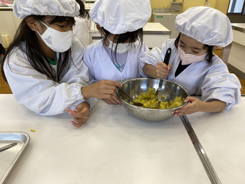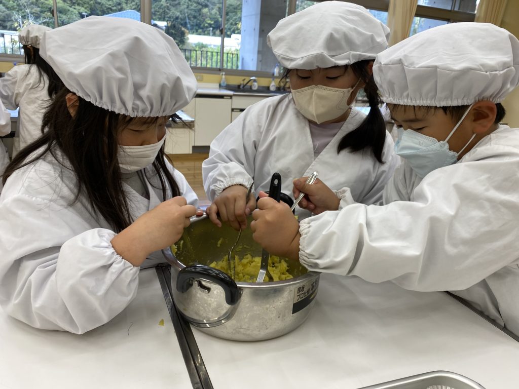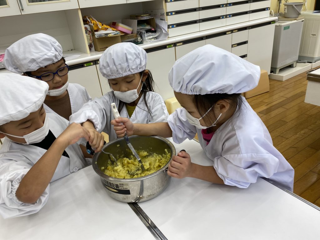 1年生は、生活科の授業で春に植えたサツマイモを収穫し、そのサツマイモとアイスクリームを使ってスイートポテト作りを行いました。自分で育てたからこその味わいは格別で、出来上がったスイートポテトはとてもおいしく、子どもたちは笑顔いっぱいで味わっていました。