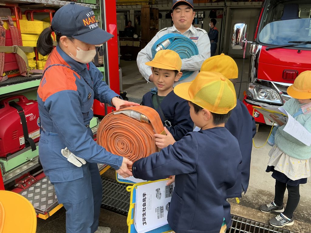社会科の学習の一環として、消防署と警察署を見学しました。消防士さんや警察官の方々から、私たちの安全を守るための仕事や訓練の様子をくわしく教えていただき、子どもたちは真剣なまなざしで話を聞いていました。実際の消防車やパトカーを間近で見て、「すごい!」「かっこいい!」と大興奮の一日となりました。