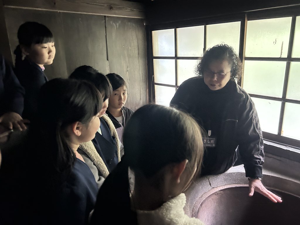 大庄屋記念館へ見学に行きました。昔の暮らしについて学び、電気やガスがまだなかったころ、人々がどのように生活していたのかを知ることができました。見学では、囲炉裏の周りに座りながら話しを聞きました。その後、実際に火起こしをしたり、館内をまわってクイズに挑戦したりしながら、昔の工夫や知恵を楽しく学ぶことができました。昔は水くみやお風呂の火をたくことは子どもの仕事だったそうです。家族の一員として自分の役割を持ちながら生活することの大切さを学びました。