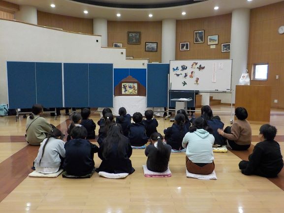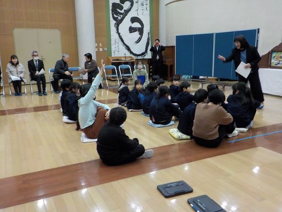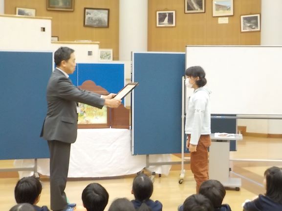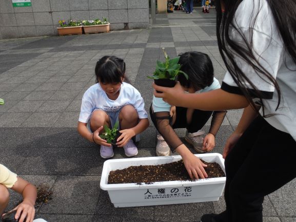 神戸地方法務局豊岡支局長さんや養父市人権擁護委員の方にご来校いただき、人権教室を実施しました。最初に、学校で育てていた「人権の花」の感謝状や記念品をいただきました。その後「ずっとともだちでいたいから」という紙芝居を見せていただき、友だちも自分もどちらも大切にすること、自分の気持ちを相手に伝えることの大切さを学びました。