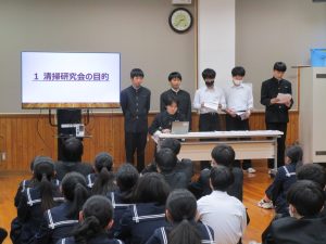 3学期の清掃研究会を行いました。環境委員会より、清掃への心構えや清掃の仕方についての説明がありました。3学期からは、2年生が各清掃班のリーダーとなります。最後は、リーダーを中心に班ごとに清掃場所の役割分担や清掃計画を立て […]