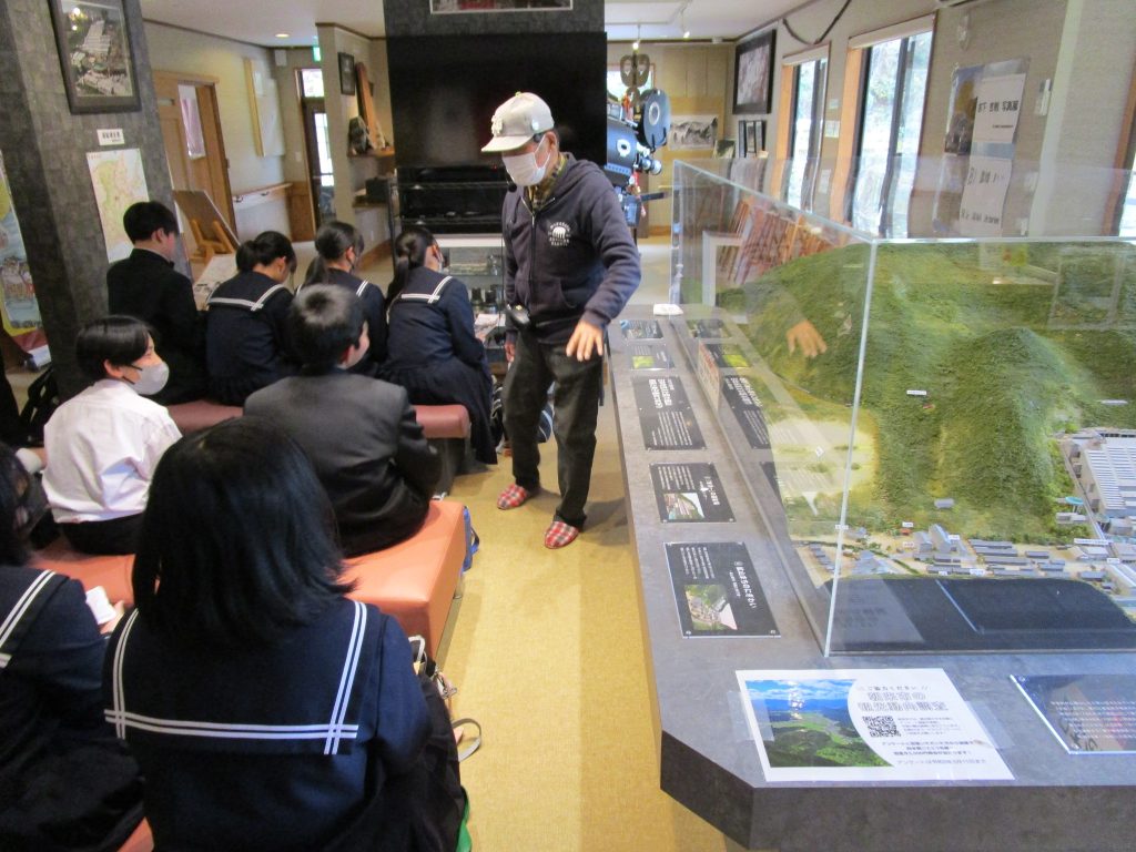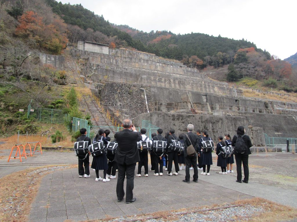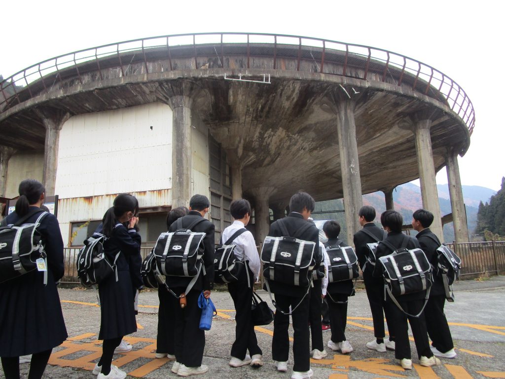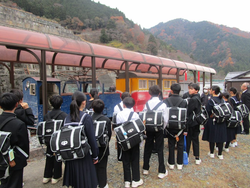 12月1日(月)1年生が「鉱石の道郷土学習活動」として、明延鉱山そして、1円電車で繋がっていた神子畑選鉱場に行きました。明延では小林区長さんに明延鉱山の歴史について学ぶと同時に、地域活性の取り組みについてお話ししていただきました。神子畑選鉱場では山内さんに神子畑と明延の関係についてや選鉱場跡の説明をしていただきました。