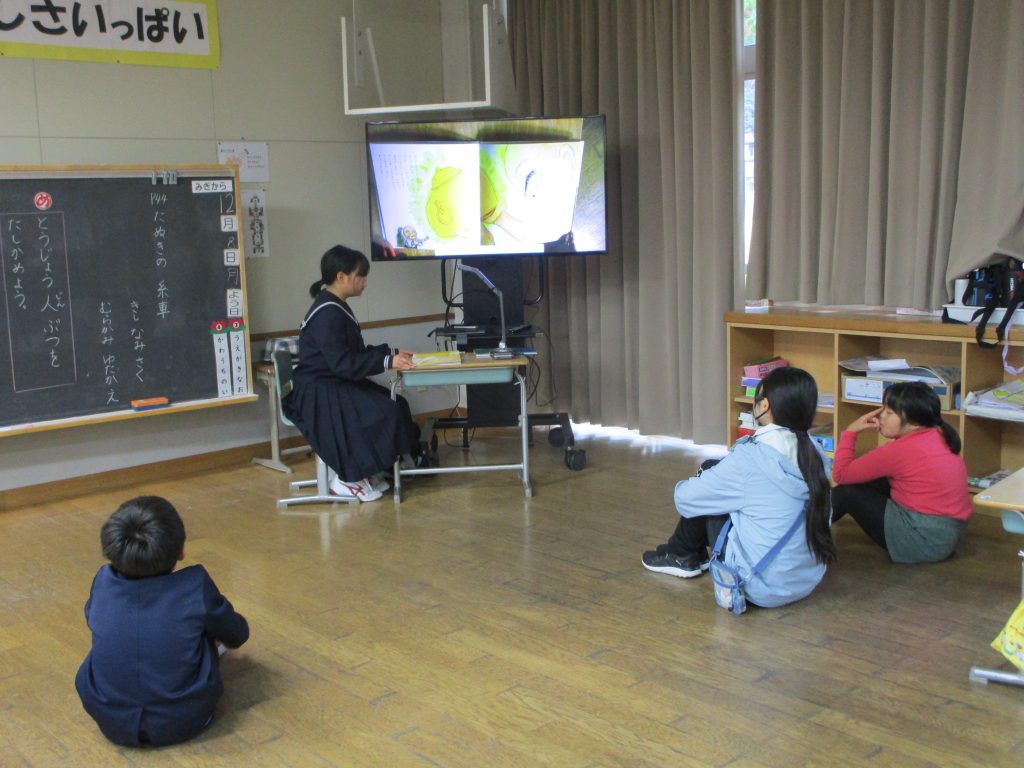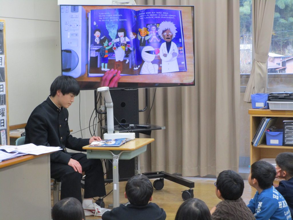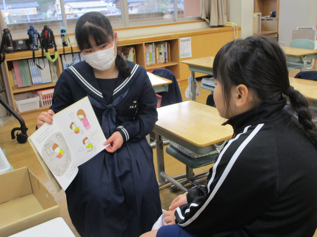 今年度2回目となる大屋小学校への中学生による読み聞かせ訪問を行いました。 中学生は読みたい絵本を自分で選び、練習をしてきました。始まるまでは強ばっていた表情も読み始めるとだんだんと和らぎ、最後は達成感いっぱいの笑顔が見られました。小学生の皆さんもじっと耳を傾け、お話やイラストを楽しみながら聞いてくれていました。本の交流を通して、心のふれあいができた貴重な体験となりました。これからもいろんな本との出会いを大切にしていってほしいものです。