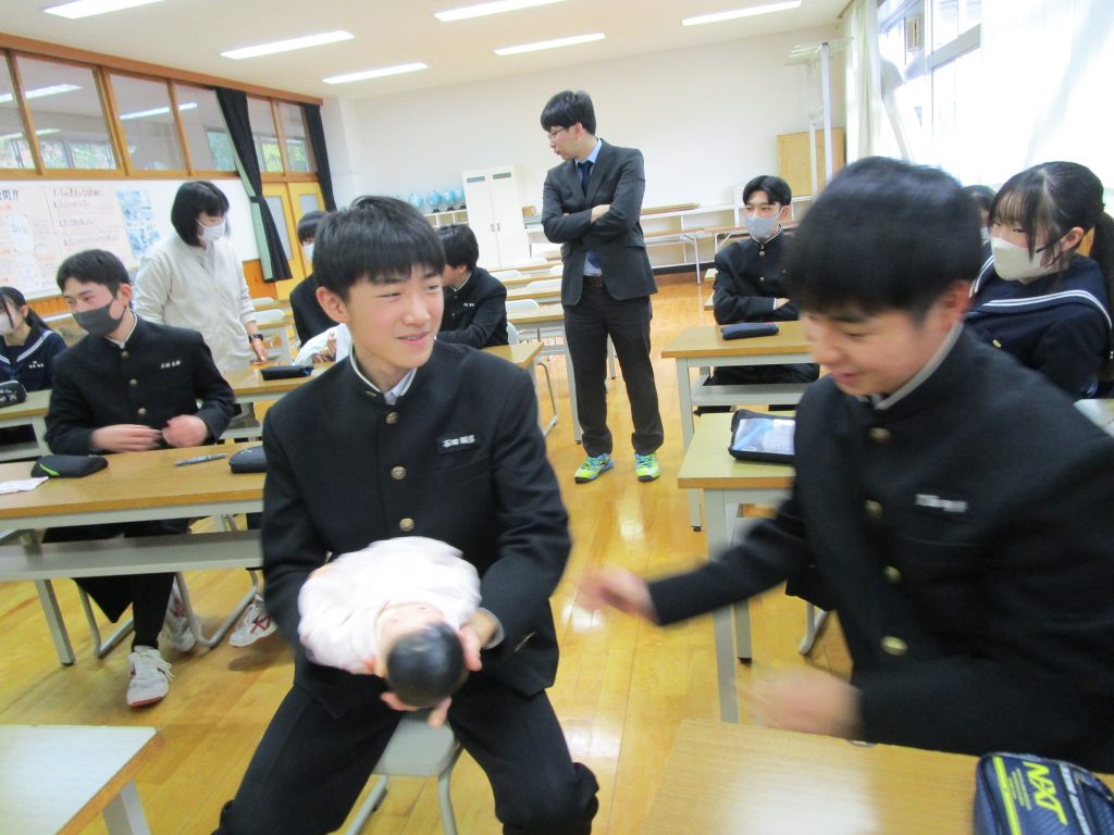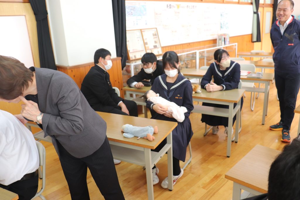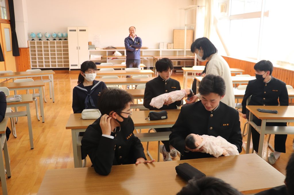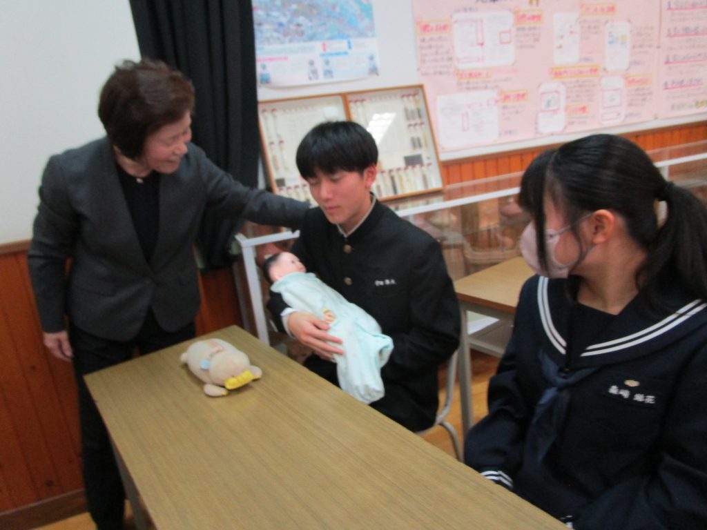 【2年生】「第二次性徴理解と、自身の生命(いのち)を見つめて」と題し、第二次性徴、生命誕生、自他の生命尊重について話を聞きました。命の大切さ、自分自身と周りの人の心と体を大切にして生きていくことについて話しを聞きました。最後に、生まれたばかりの赤ちゃんと同じ大きさ・重さの人形を抱っこして、今大きく育っている自分と比較し成長を実感していました。