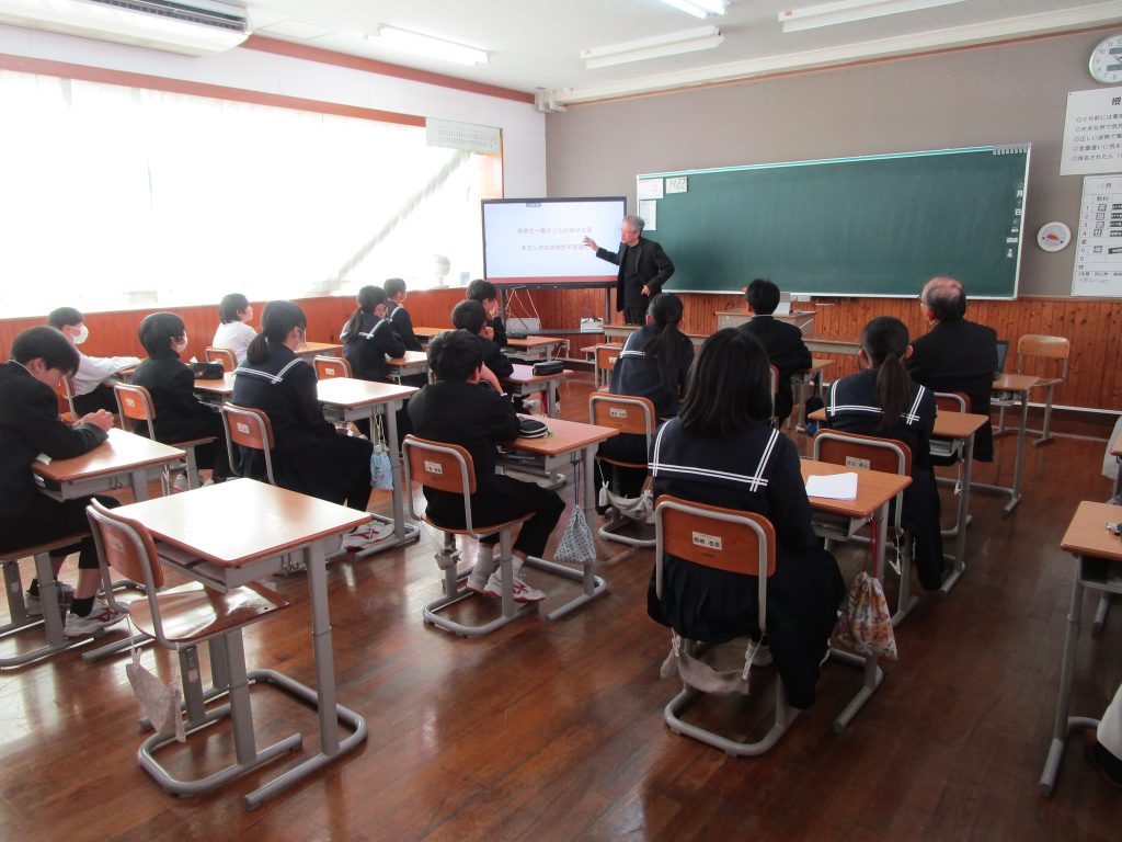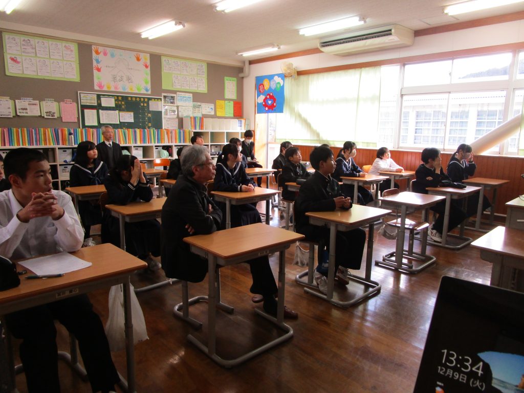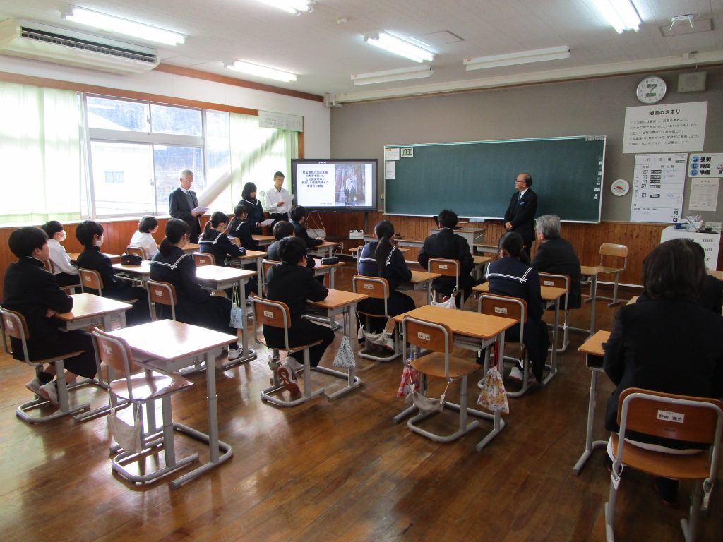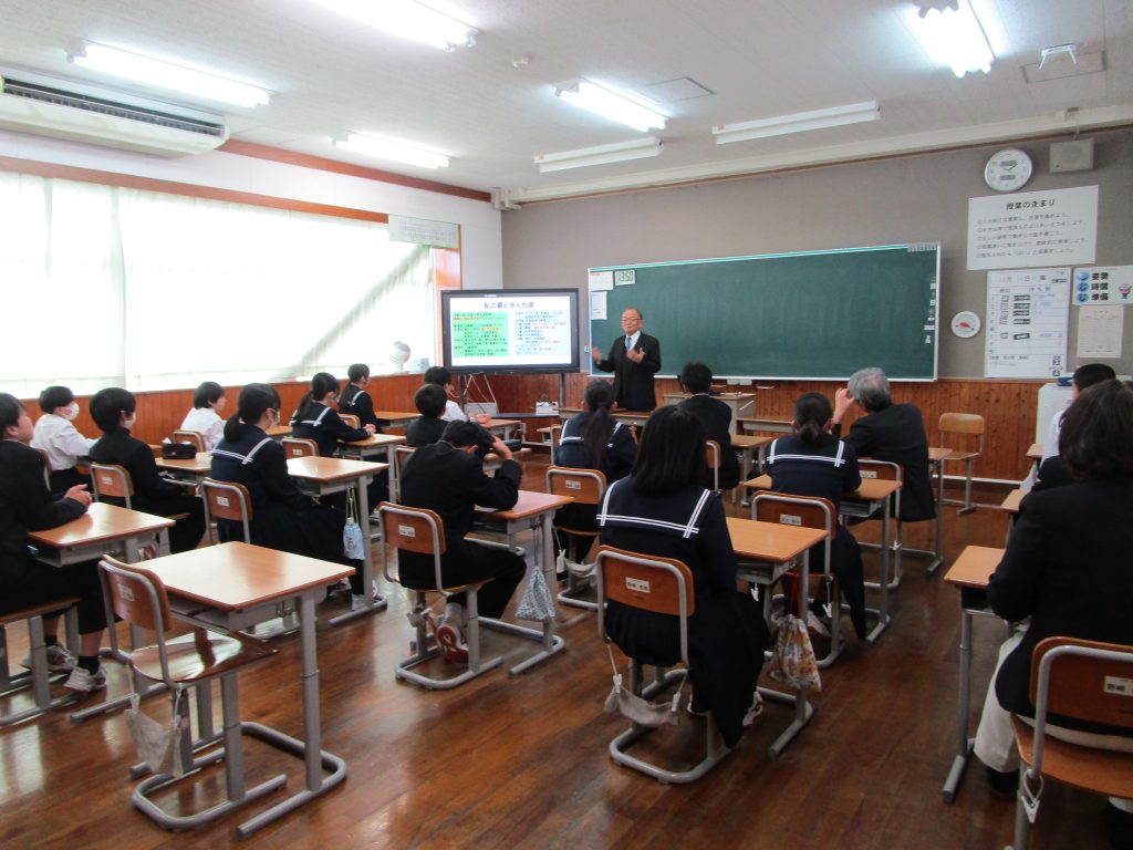 京都大学医学研究科メディカルイノベーションセンター特任教授・京都大学名誉教授の中尾一和氏(養父市出身)、京都教育大学教育学部名誉教授の村上忠幸氏(養父市出身)の二人の大先輩をお迎えし、「先輩と考える私たちの未来について」と題し、中学1年生講座を実施しました。中尾氏からは「脳と体を鍛える!今しかない!」「慌てず、焦らず、恥ずかしがらず、諦めず…夢を実現させてほしい!」、村上氏からは「教科書のある学びと教科書のない学び(自分から考えてすること)を両輪としてつなぎ、自己実現しながら未来を切り拓いていこう!」という熱いエールを送っていただきました。日本で、そして世界で活躍されている大先輩の迫力あるお話に生徒たちの目は輝いていました。夢を持ち、それに向かって努力を重ねることの尊さを教えていただきました。