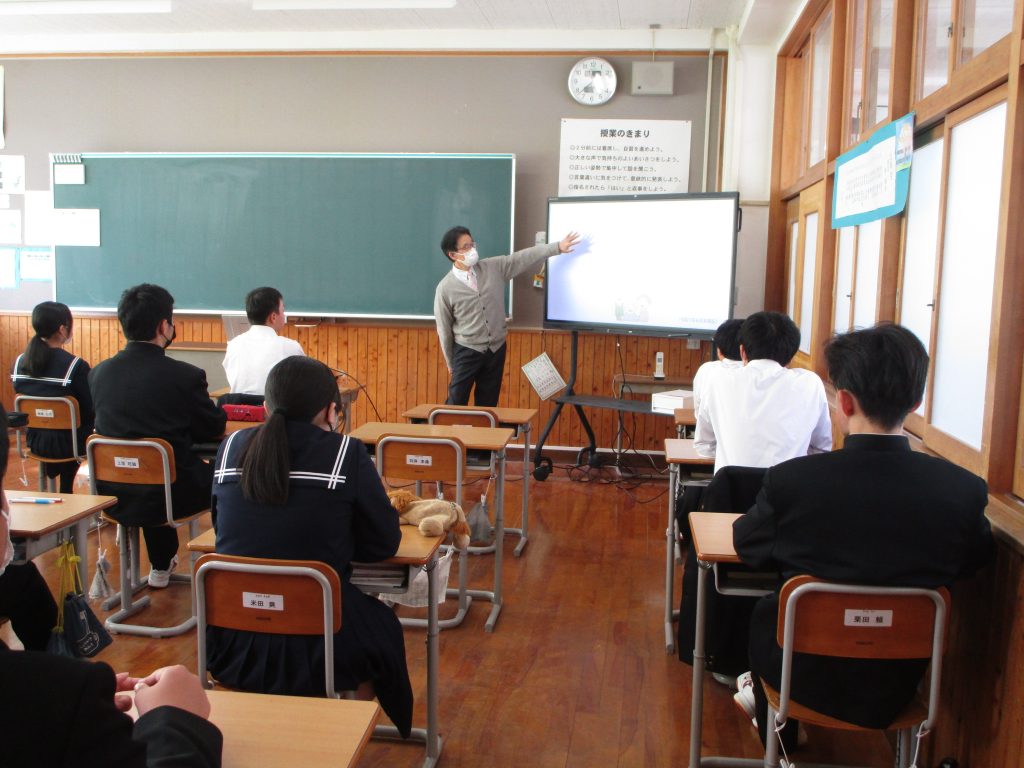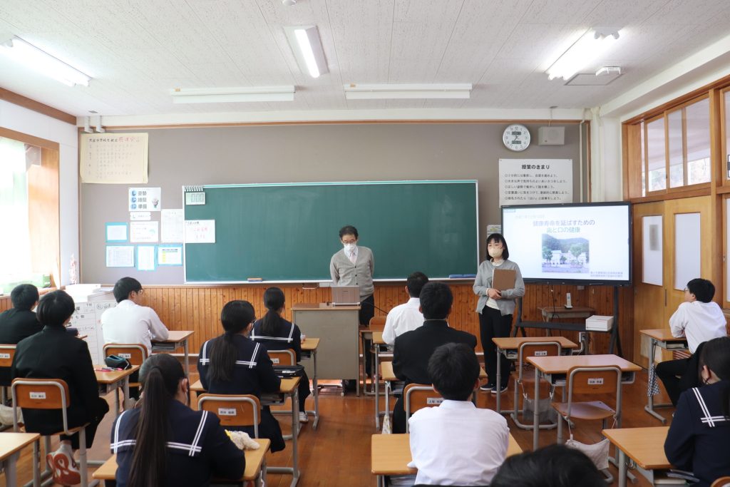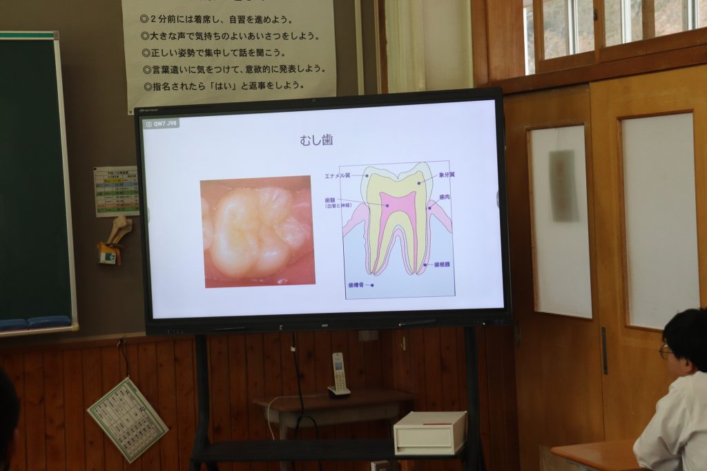 学校歯科医の大屋歯科診療所 砂治先生に来ていただき、「健康寿命を延ばすための歯と口の健康から」と題し、3年生にお話をしていただきました。歯の健康を守るために、う歯や歯周疾患について、咀嚼の大切さや、よい生活習慣が歯の健康につながることなど、新しい知識を知るとともに、今までの生活を振り返ることができました。また「平均寿命」は長くなってきていますが、健康に生き生きと過ごすことができる期間「健康寿命」が長くないと楽しく生活できません。口腔の健康と関連づけて、「健康寿命」の話もしていただきました。これからの健康作りに役に立つ大切な話でした。