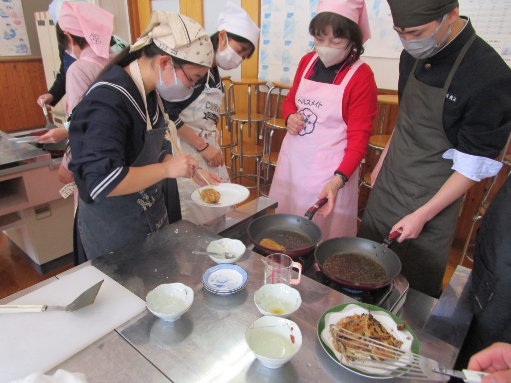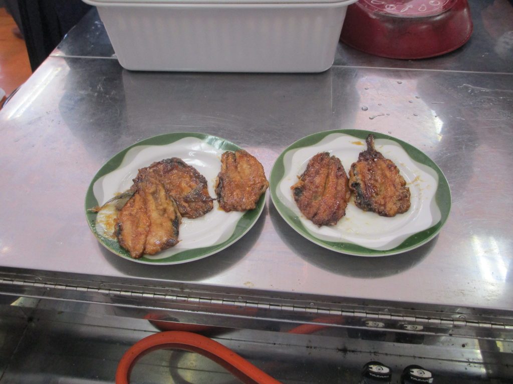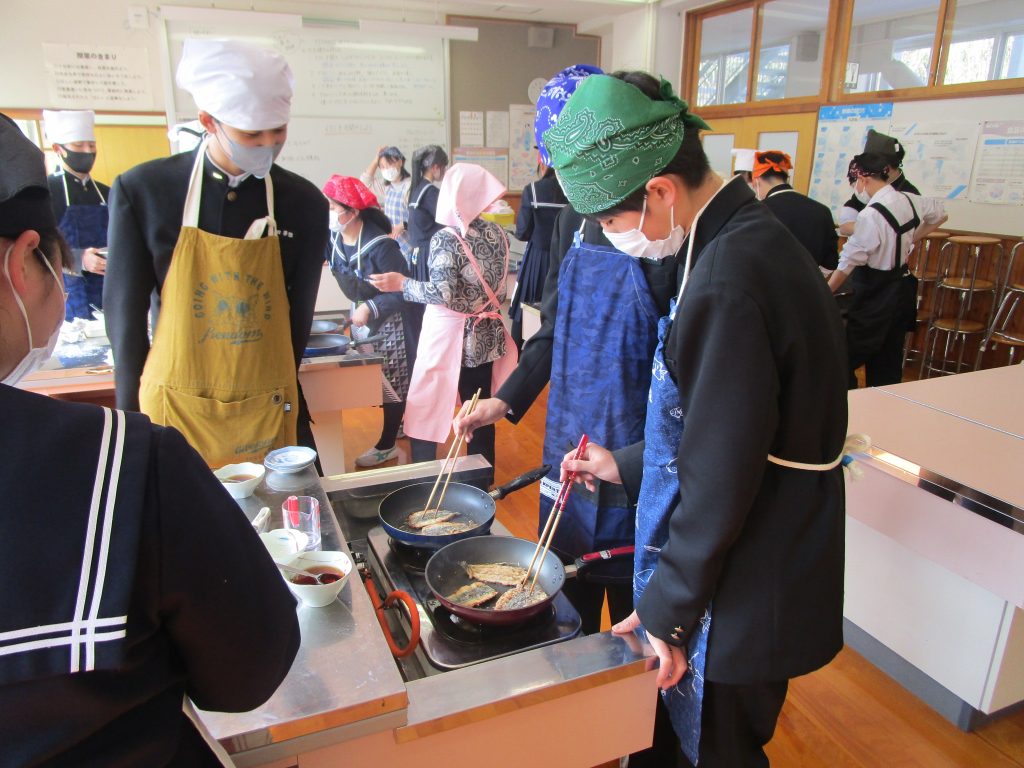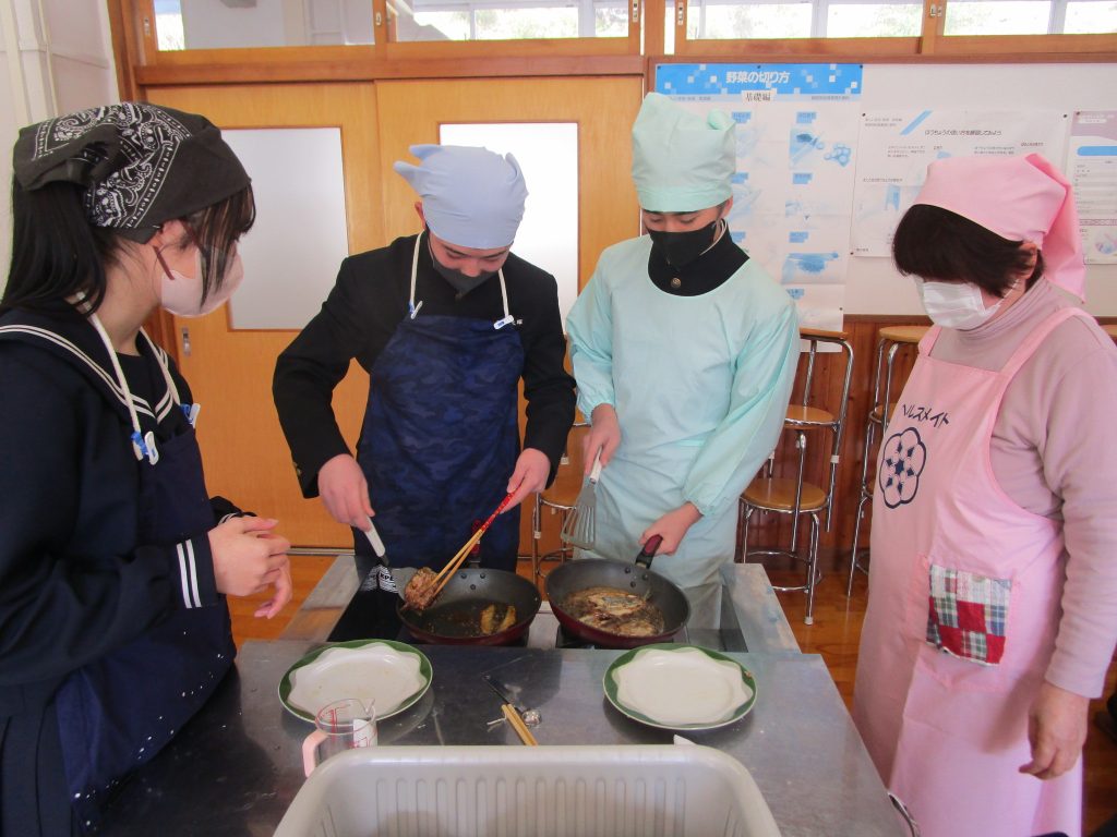 3年生に続き、2年生が家庭科で調理実習を行いました。2年生はいわしを手で開いてかば焼きにしました。生の魚の感触や、たれをからめて焼く香ばしいにおいなど、五感をフルに働かせながらおいしいかば焼きを仕上げました。今回も、いずみ会の3名の指導ボランティアの方にお世話になりました。ありがとうございました。