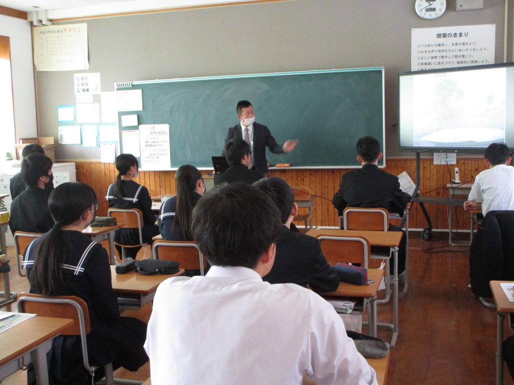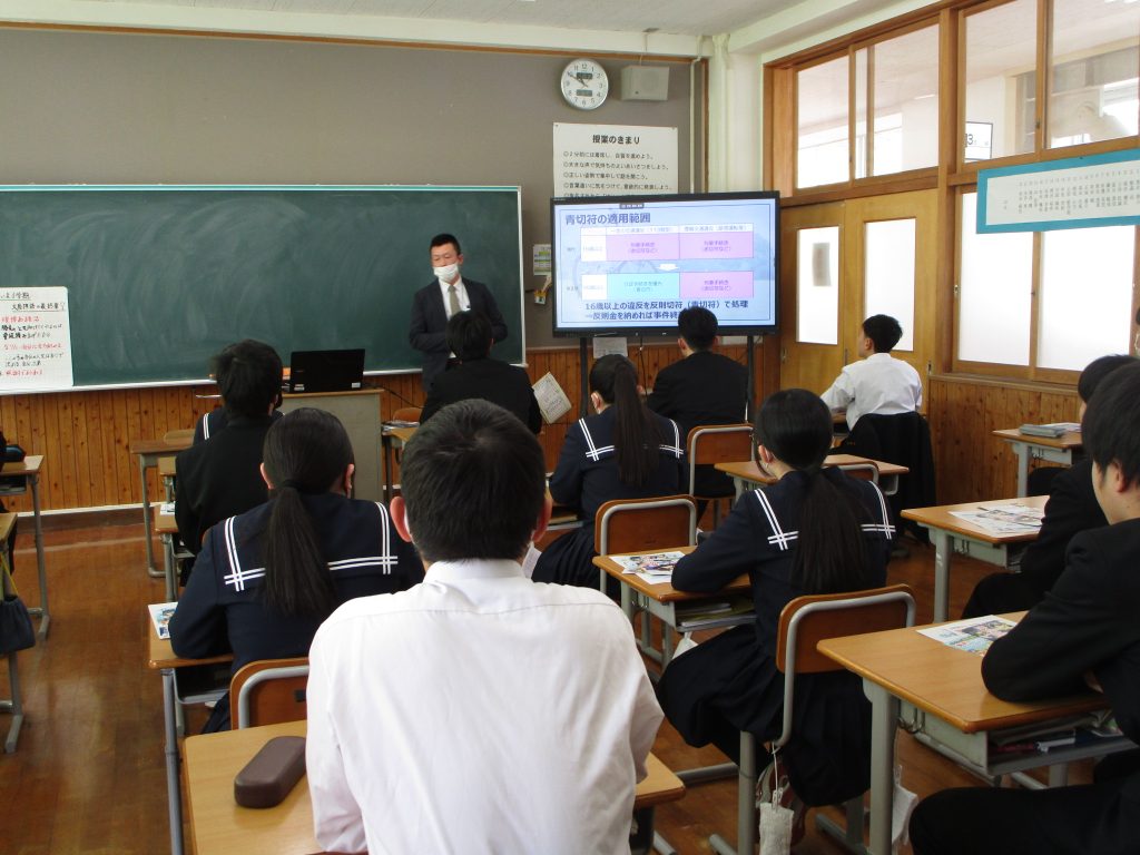 南但馬警察署交通課より講師をお招きし、3年生を対象に「自転車に関する交通安全教室」を実施しました。令和8年4月より自転車にも交通反則通告制度が適用されます。その内容についての説明を受け、法の制度について学ぶことができました。また、罰則対象となる違反行為についても詳しく解説していただき、身近なところに自転車乗車の危険が潜んでいることを教えていただきました。高校進学を控え、4月から自転車通学を考えている生徒もあるようで、最後にはたくさんの質問が出ていました。