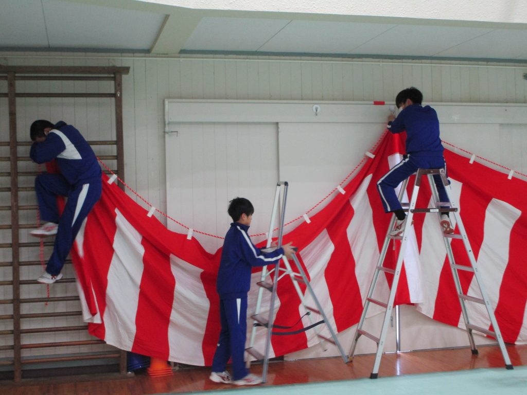 明日の卒業式に向け、1.2年生が心を込めて会場の準備を行ってくれました。ステージ・フロア・3年生教室の飾り・体育館周辺の清掃等、役割ごとに時間内に仕事をやり切り、素晴らしい会場が出来上がりました。明日は、大屋中一丸となって3年生の門出をお祝いしましょう。