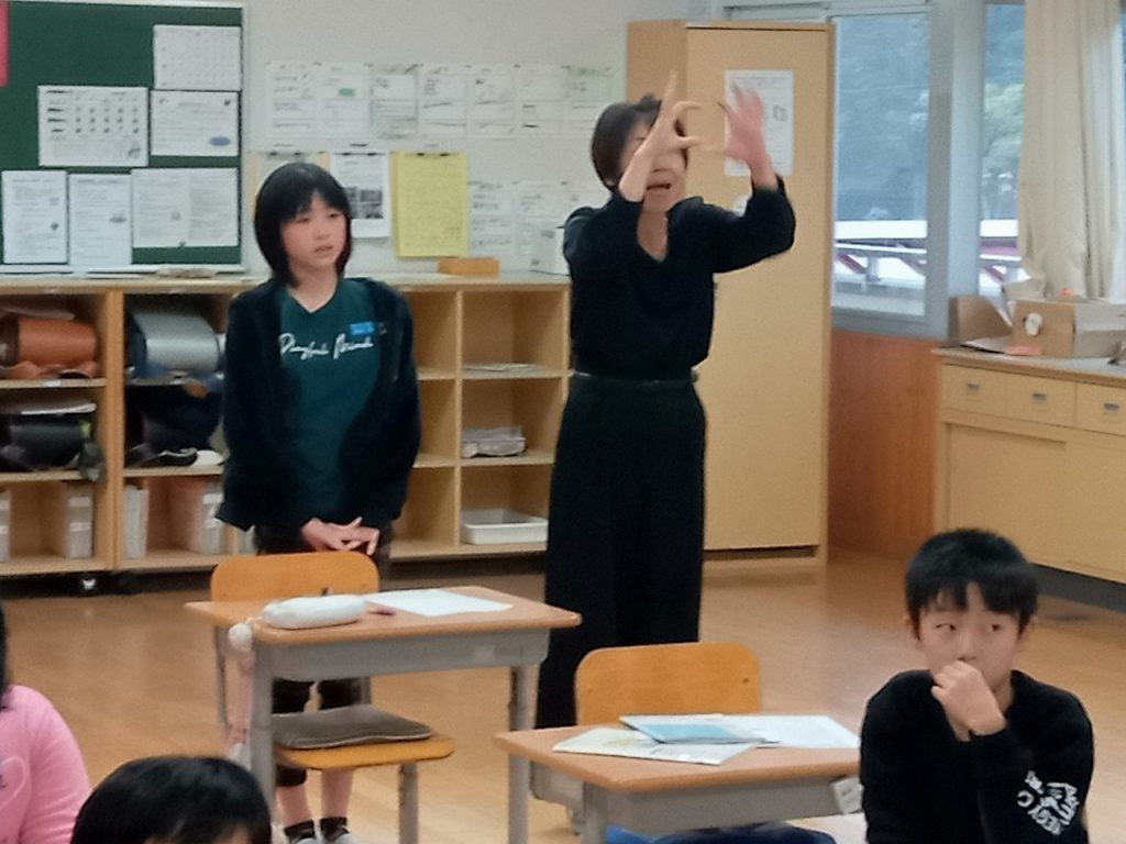 今週、4年生の福祉教育で手話教室が行われました。兵庫県聴覚障害者協会からろう講師として嘉田さんと聞こえる講師として小野山さんに来ていただき、耳が聞こえない方の日常生活や会話の方法について教えていただき、4年生は聴覚障害について詳しく学習することができました。耳が聞こえない方のコミュニケーションとして(身ぶり、口話、筆談、空文字、手話)を紹介していただいた後、手話について学びました。子どもたちは様々な手話を学んだ後、積極的に手話でコミュニケーションをしている様子が見られました。今回の学習が、共助の心を広げる機会になったらと思います。お忙しい中、嘉田さんと小野山さんには関宮学園にお越しいただき、ありがとうございました。