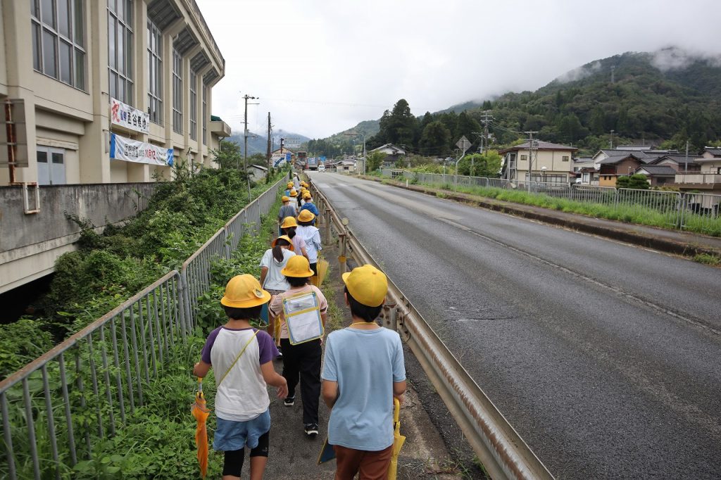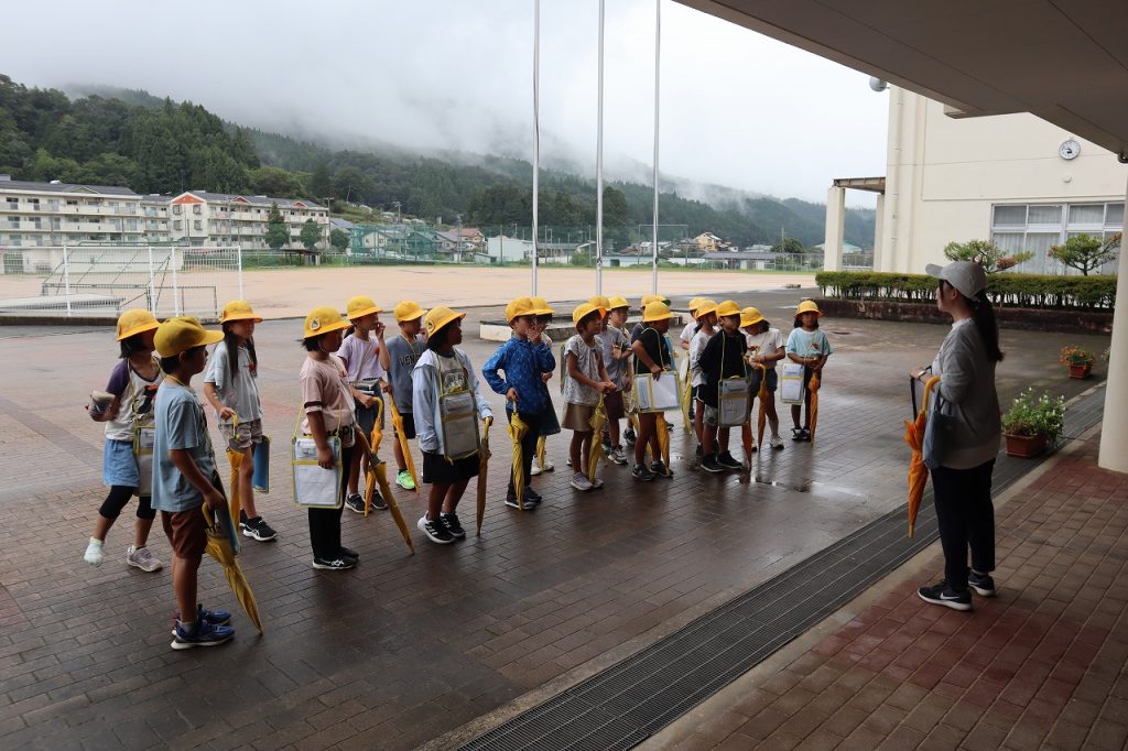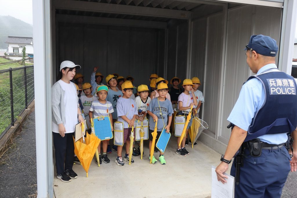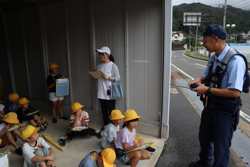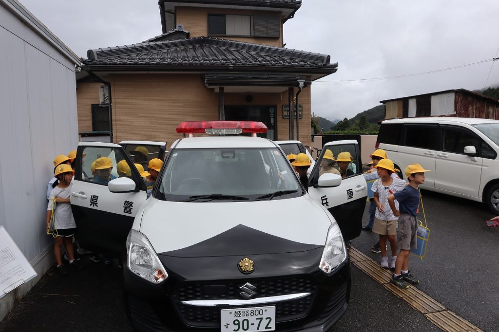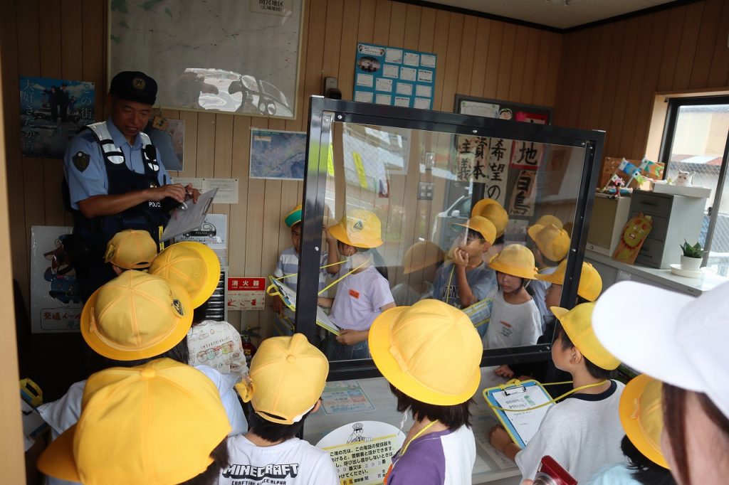 生活科の学習「まち探検」で関宮駐在所にお世話になりました。小雨が降ったりやんだりする天候でしたが2年生の児童はとても張り切って駐在所に行きました。雨が降っていたのでガレージの中で説明を聞いたり、質問したりさせていただきました。警察官の服装や持ち物の説明や駐在所の仕事内容などの話を聞きました。駐在所の建物やパトカーの中も見学しました。最後に「なぜ警察官になろうと思ったのですか」「悪いことした人を捕まえたことがありますか」など質問をしました。駐在所の滝下さんは詳しく質問に答えてくれてとても勉強になりました。学校に帰ってから「将来警察官になる」といった声が聞こえてきました。