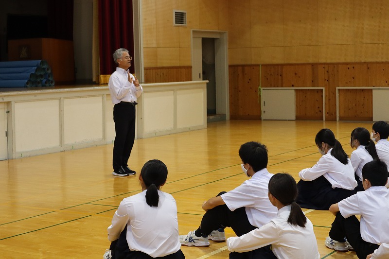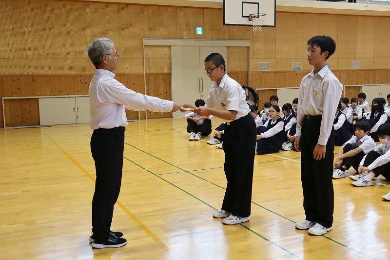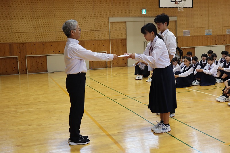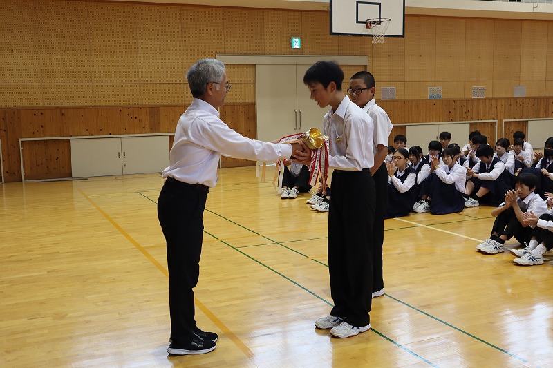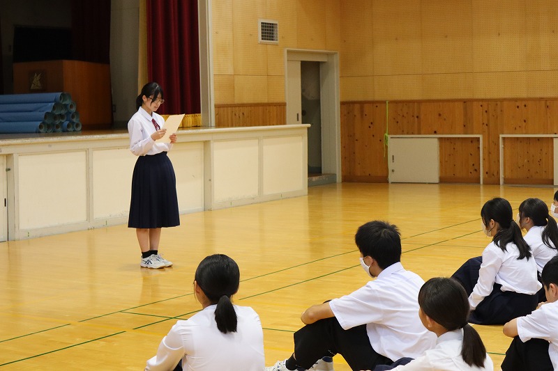 夏休みに行われた市内中学校新人野球大会の表彰と、先日行われた但馬秋季陸上競技大会の表彰を行いました。そして、生徒会執行部から、文化祭の幕間パフォーマンス選手権の募集について説明がありました。今年も楽しいパフォーマンスを期待しています。オーディションがありますので、たくさんのエントリーを待っています。校長先生からは、2学期の中間考査に向けての勉強の仕方についてお話がありました。14日(火)から4日間で行われます。計画を立てて取り組みましょう。