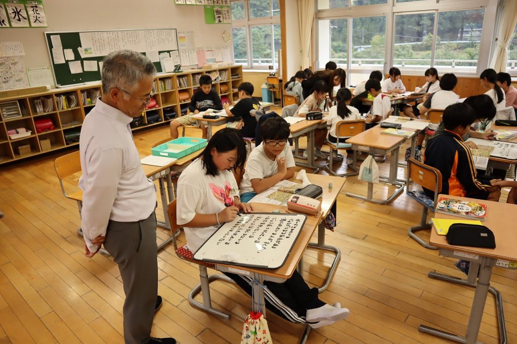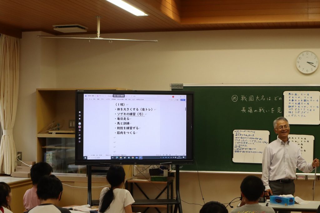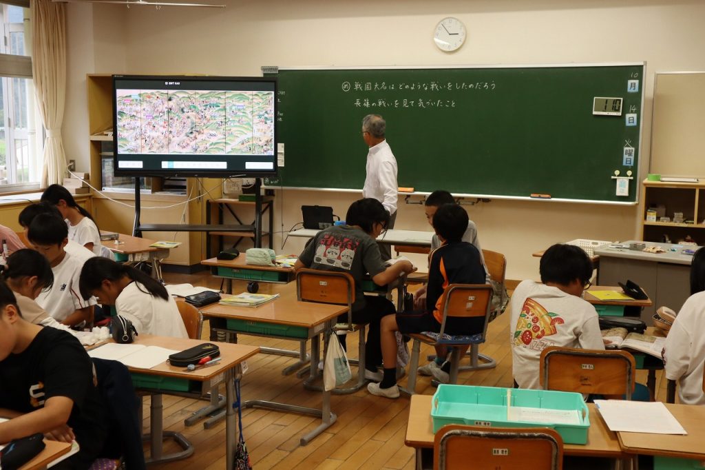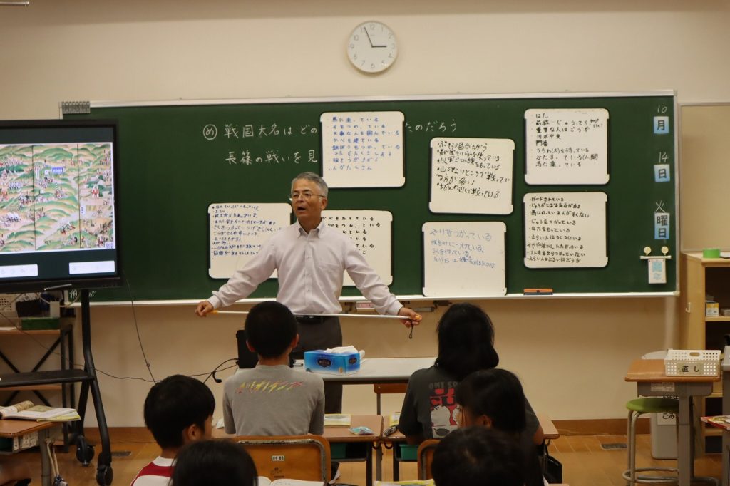 6校時の社会科授業にゲストティーチャーに来ていただいています。歴史の授業で鉄砲やキリスト教が日本に伝わったところを学習しています。日本にどのように伝わったのか、鉄砲が戦に使われたり日本で作られるようになったりするところを詳しく知ることができました。大阪府堺市で鉄砲が作られ後に自転車が作れるまちに変わっていく話もあり、歴史はつながっているということが分かりました。次回も来ていただけるようです。