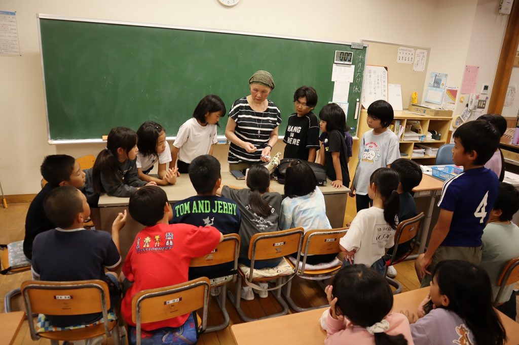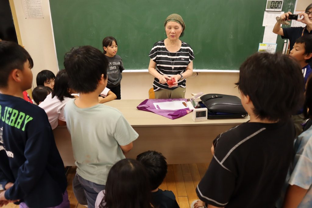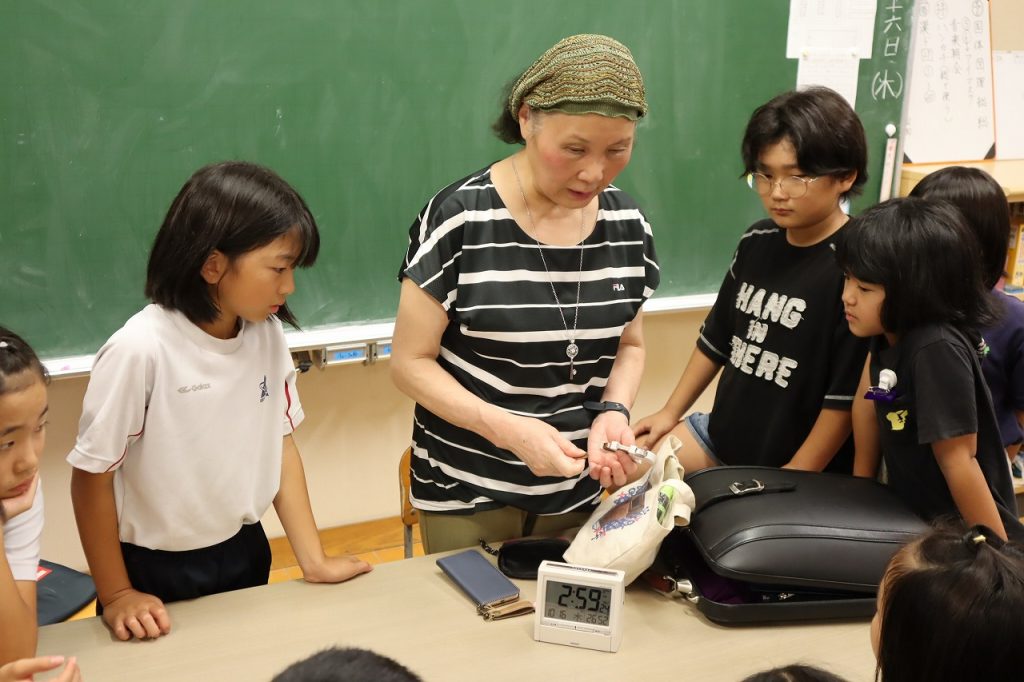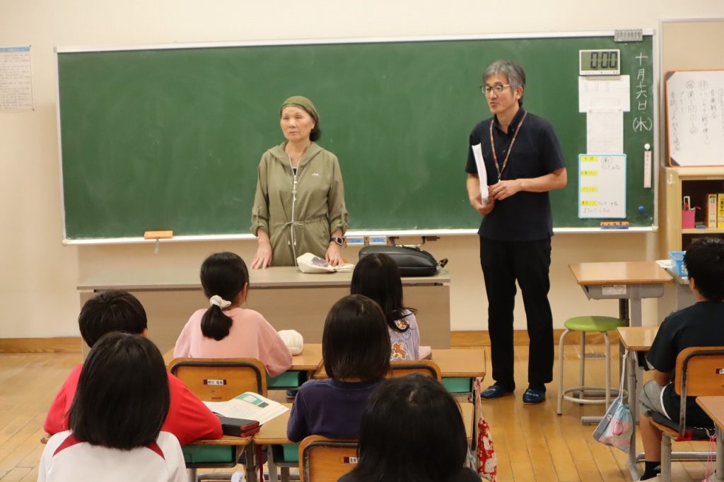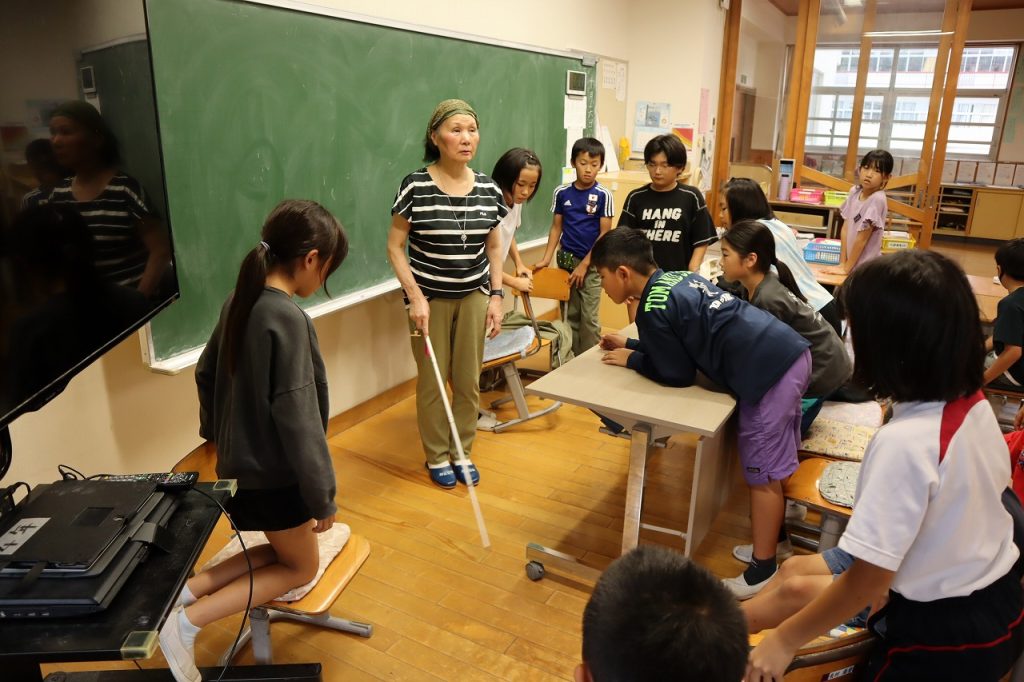 5校時と6校時に4年生の福祉教育の一環として視覚障がいについて、西山さんを講師としてお迎えし、お話をしていただきました。視覚障がいとなった経緯や今の生活の状況を話したあと、リンゴの皮むきやきゅうりを薄く輪切りする実演を見せてくれました。見えてないのに手際よく包丁を扱う様子にみんなビックリしていました。「白杖を持っている人を見たら声を掛けてあげてください」ということや、スマホやいろいろな機器を上手に使って生活していることも知り、驚くことが多い1日になりました。