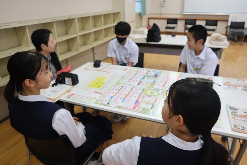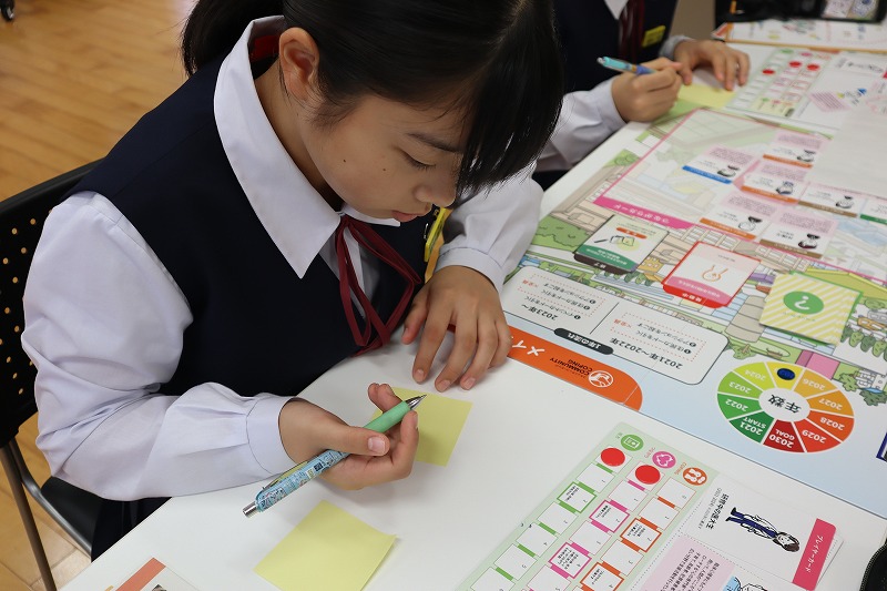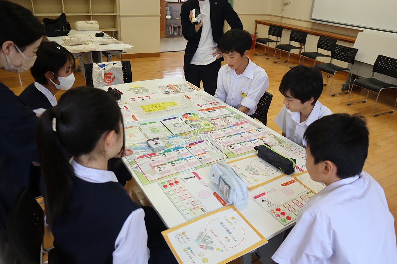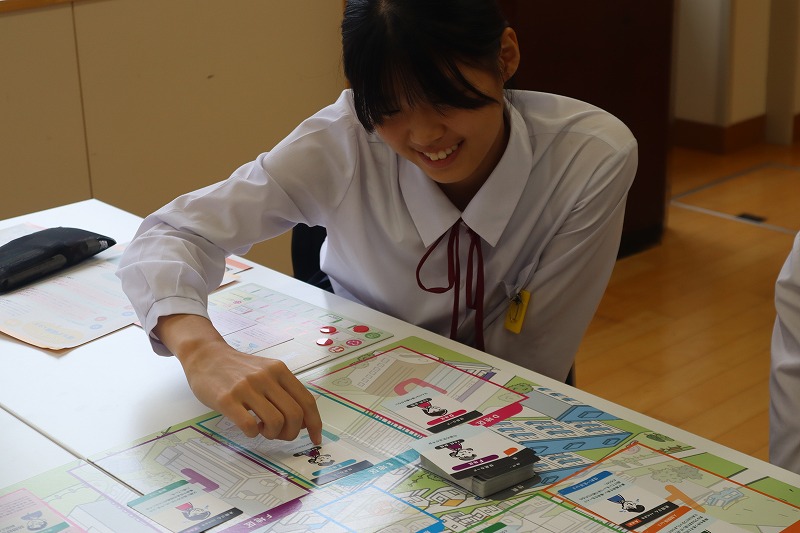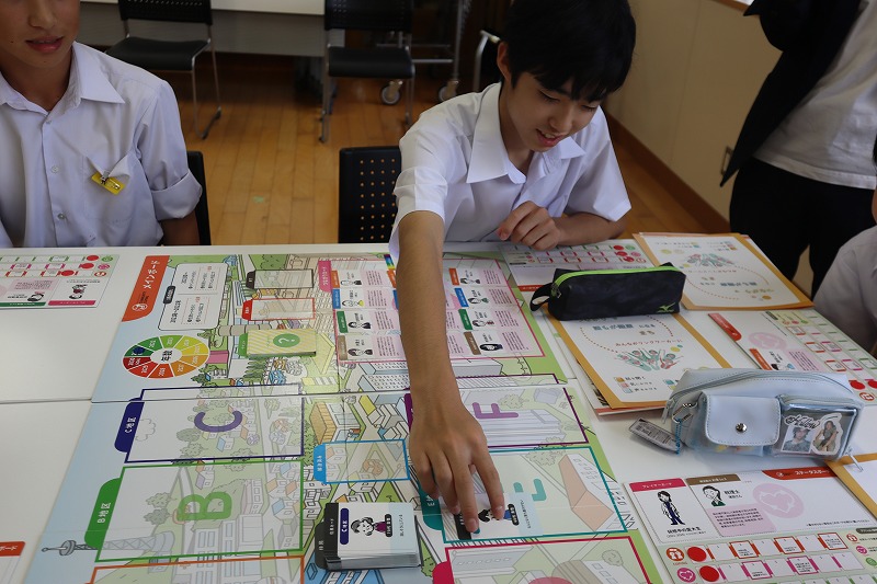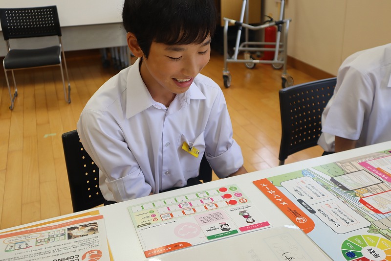 2校時に、養父市健康福祉部の方をお招きし、高齢者福祉について考えました。福祉政策や地域の関わりの仕方についてゲームを用いてシミュレーションしながら楽しく学ぶことができました。グループでどのような働きかけができるかを考察し、アイデアを出し合って問題解決を行う学習でした。市の福祉部の方にアドバイスをいただきながら進めていきました。