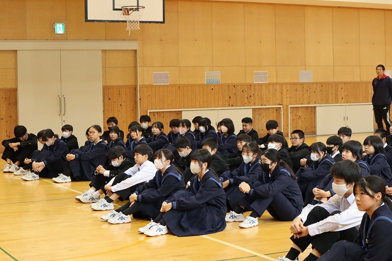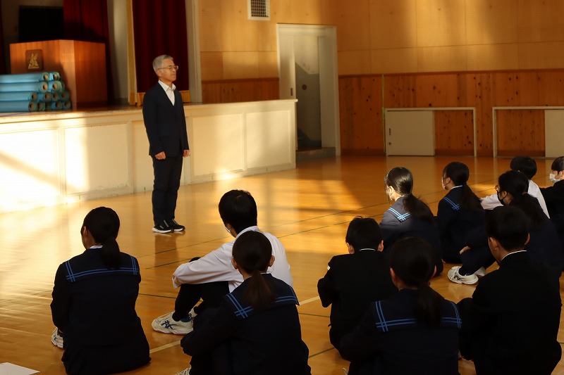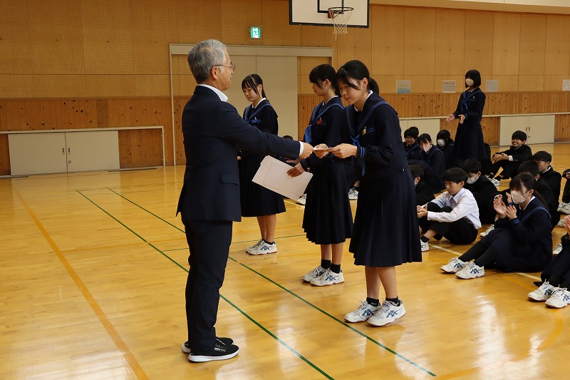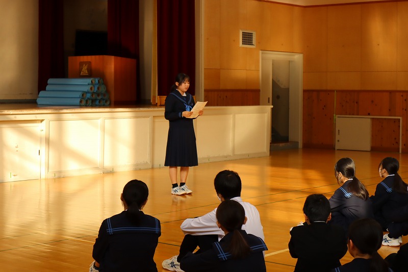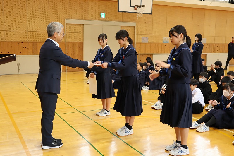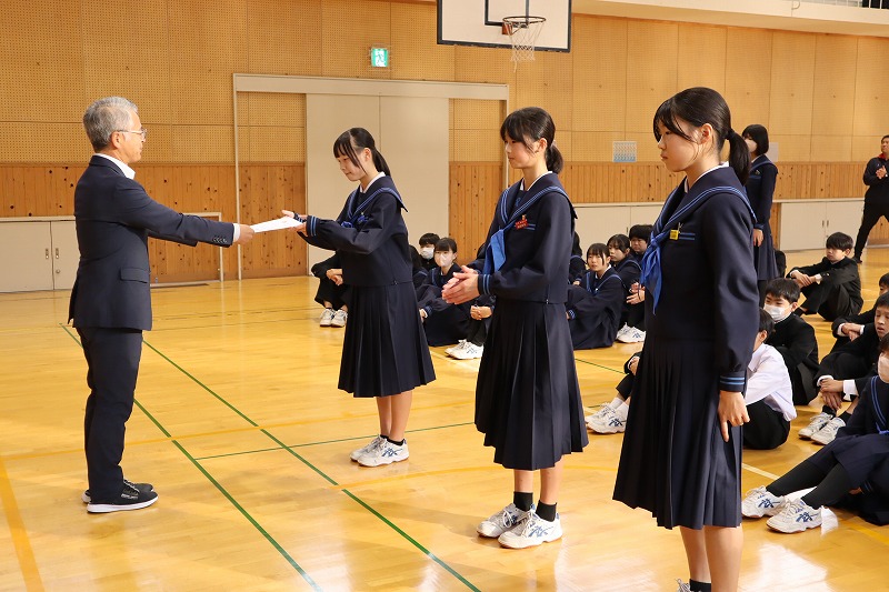 先日行われた但馬中学校駅伝大会の表彰と、校長先生からの話、衛生部から「ねるねるウィーク」についての話がありました。駅伝大会は、チームで3位と、区間賞生徒の表彰をしました。現在女子チームは、15日(土)奥神鍋周回コースで行われる兵庫県大会に向けて、朝練習を頑張っています。健闘を祈ります。