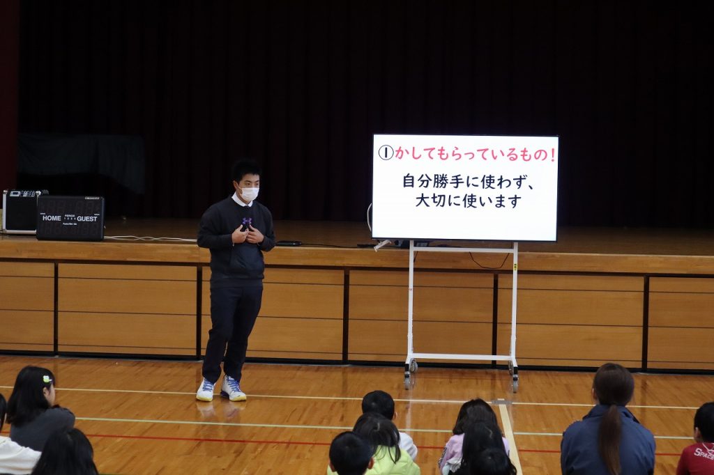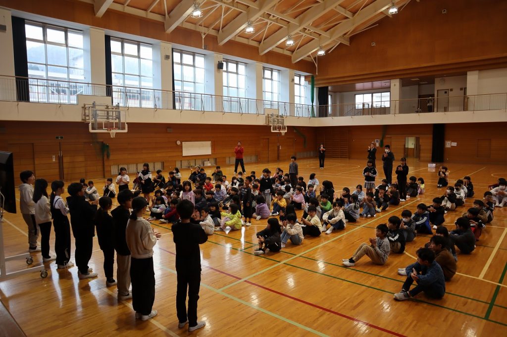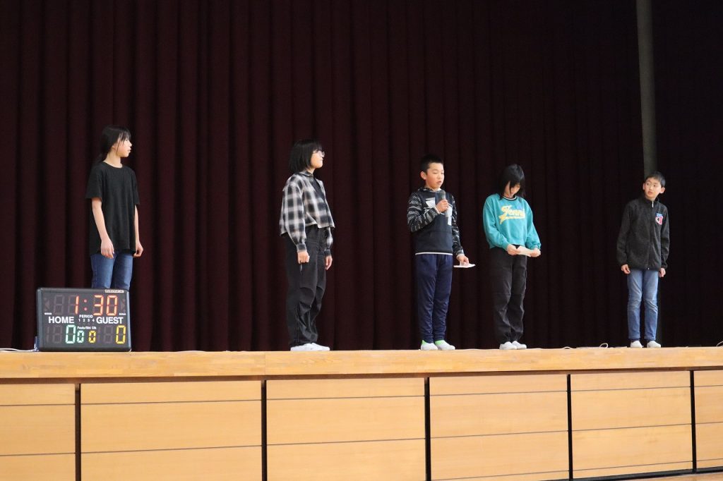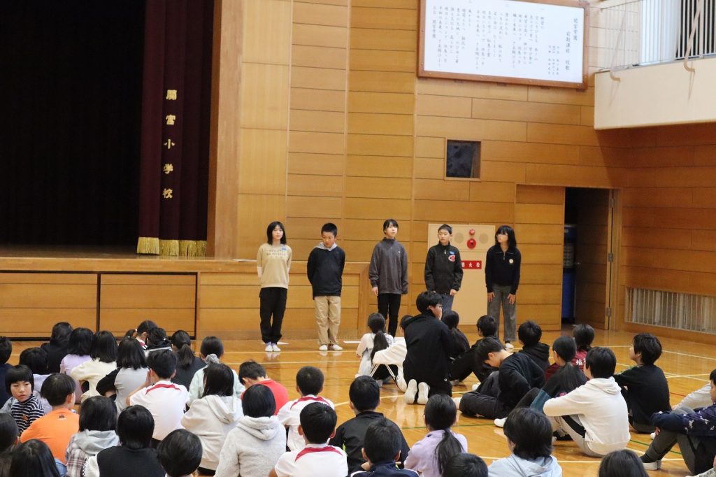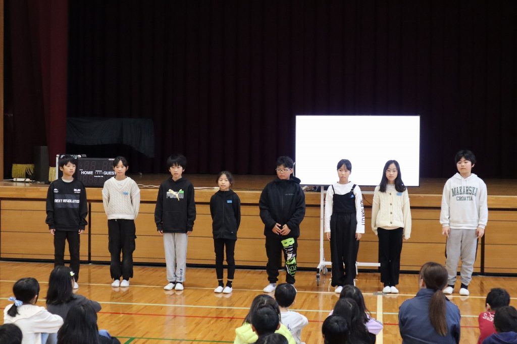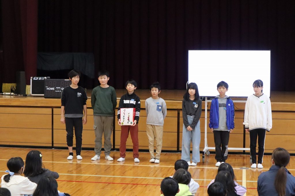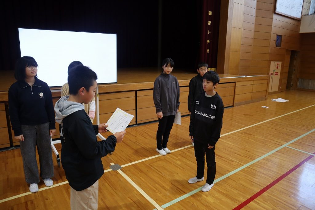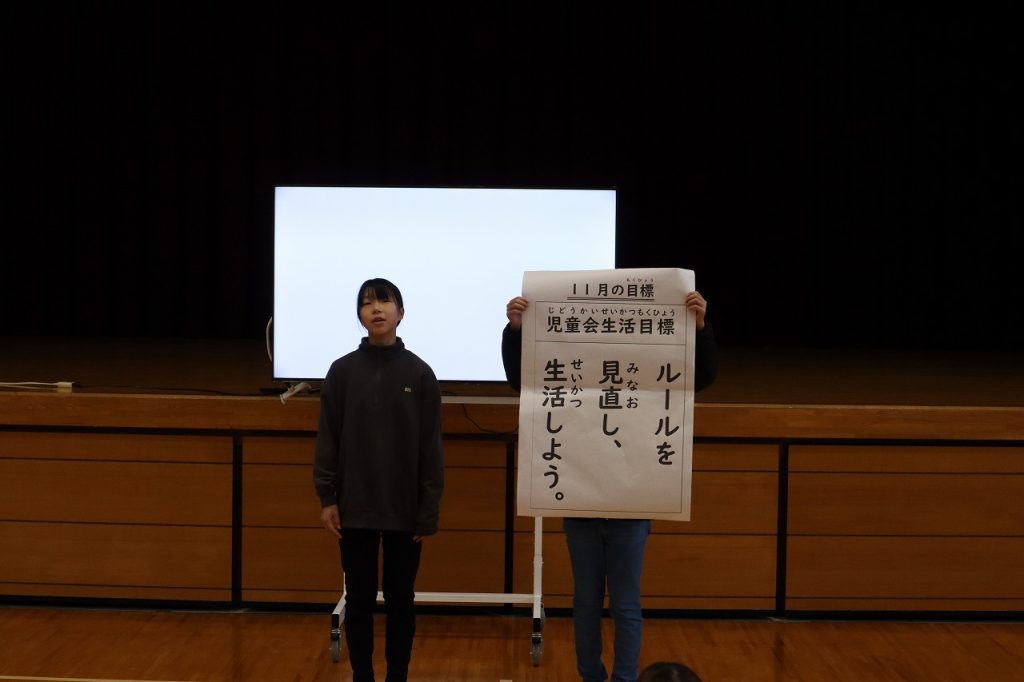 児童朝会では11月の月間目標を発表したり、昨日行われたユーユータイム(縦割り班対抗 大縄大会)で1位を取った班の表彰をしたりしました。また、衛生部が毎月行っている今月のお誕生日紹介や朝のあいさつ運動で一番あいさつが良かった地区の表彰なども行いました。児童会主導でしっかり進められていて、下半期の総務部中心に各専門部も責任を持って取り組めています。最後は恒例の全力行進で教室まで帰りました。
