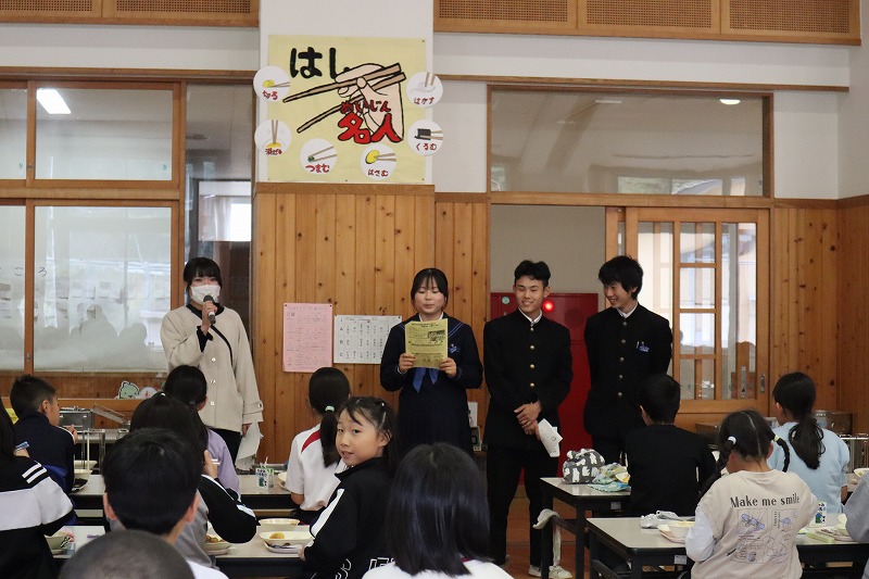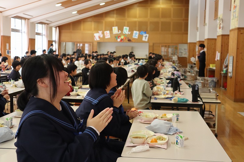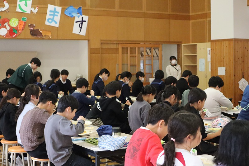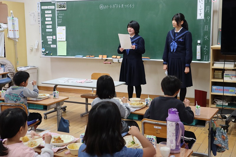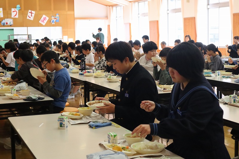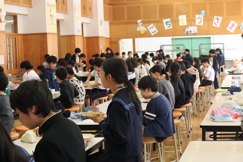 後期課程の9年生が前期課程ランチルームへ行き、交流給食を行いました。衛生部が企画し、交流を通して食を楽しむことや、食と健康について考えました。久しぶりに前期課程のランチルームで給食を食べるということもあり、9年生もとても新鮮な気分で準備をしていました。衛生部から「食べるものが健康な身体をつくること」について話がありました。午前中に行った石焼き芋もみんなで少しずついただき、とても良い時間になりました。