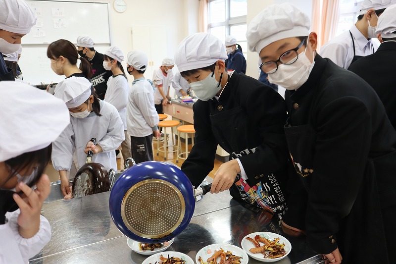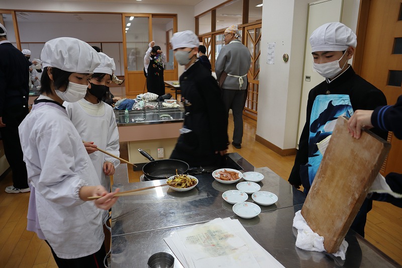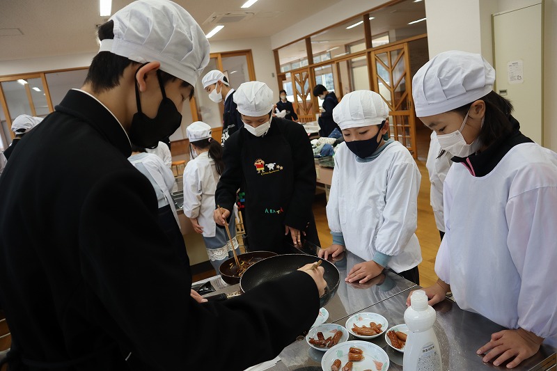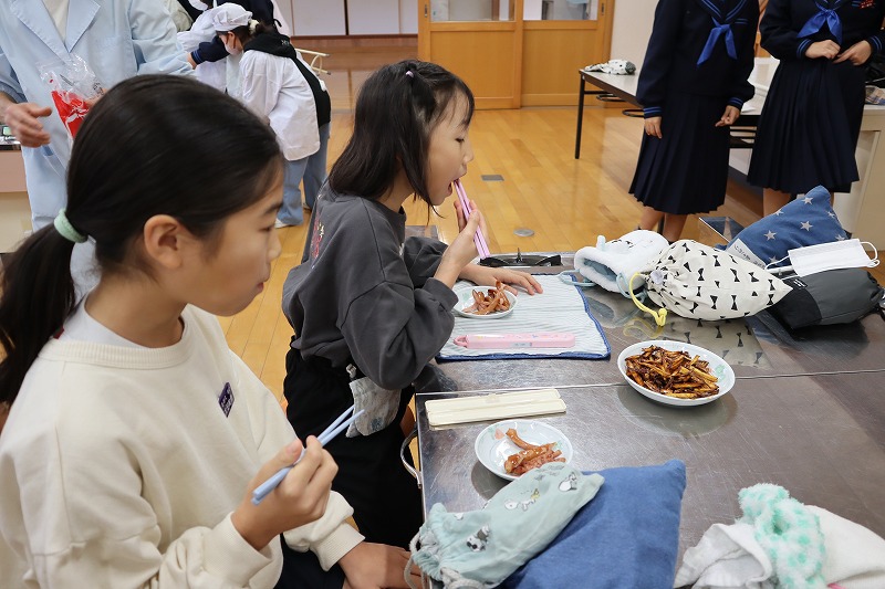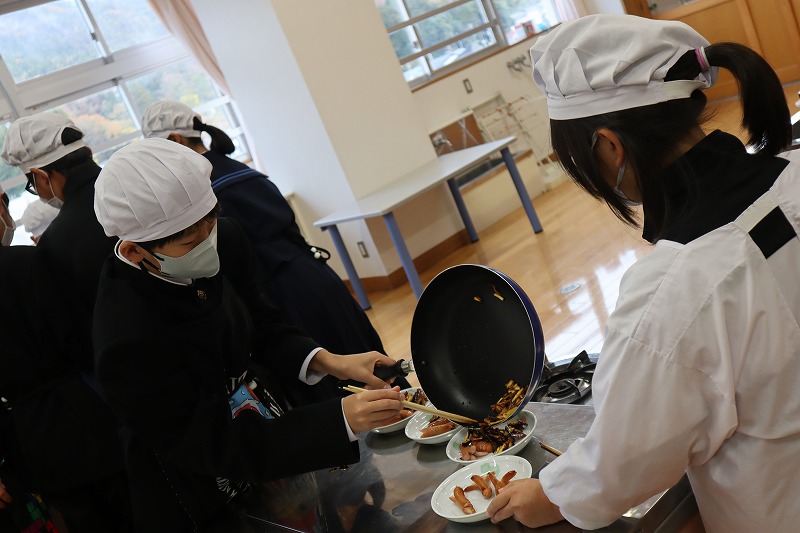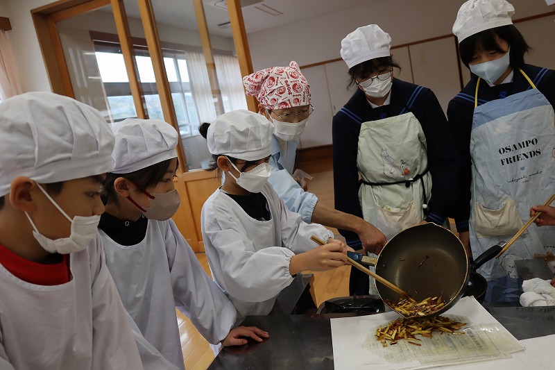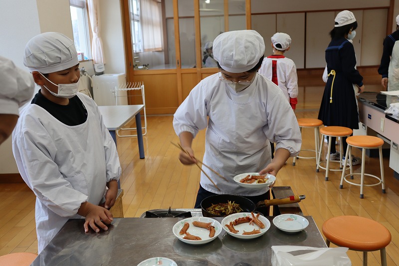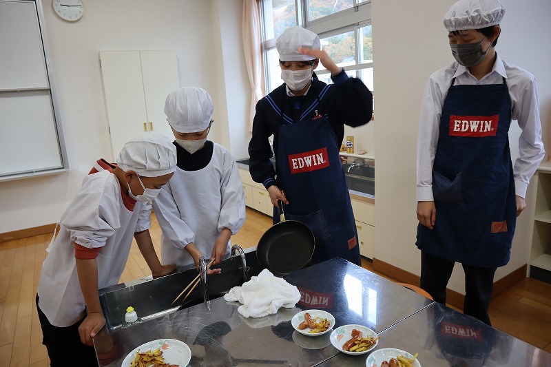 1校時に「マイ弁当の日」に向けたおかず作りの調理実習を行いました。今回は、7年生と4年生が一緒に「芋けんぴ」と「焼きソーセージ」を作りました。7年生が上手に声をかけながら作りました。みんなで分け合って雰囲気良く試食しました。これで自分で作れるおかずのレパートリーが増えました。前期後期で交流しながら調理ができるのも、義務教育学校ならではの活動です。