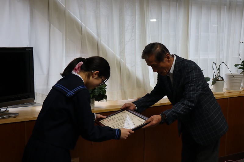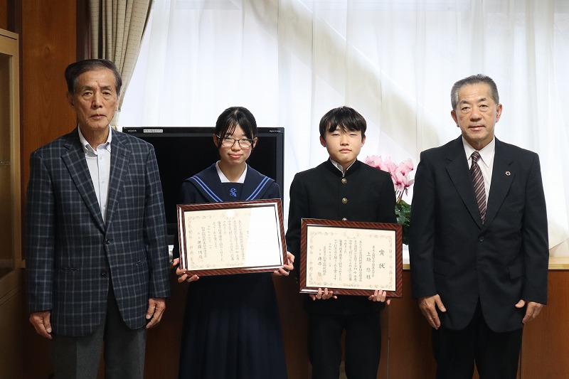9年生は社会科で公民分野を学習し、税についても学びます。税についての作文を書きました。目的は、税金のしくみや役割を理解することです。税は社会を支える重要な仕組みですが、普段は意識しにくいものなので、作文を書くことで、税金が教育・医療・道路整備などに使われていることを学び、社会の仕組みを理解する力を養います。「なぜ必要なのか」や「どのように使われるべきか」という自分の意見を書いた9年生2人の作文が、和田山納税協会会長賞と和田山納税貯蓄組合連合会会長賞に選ばれ、本校校長室で表彰していただきました。