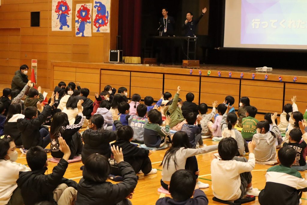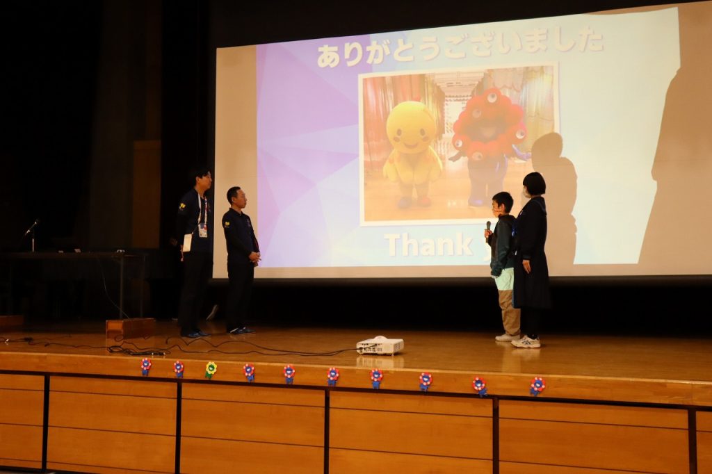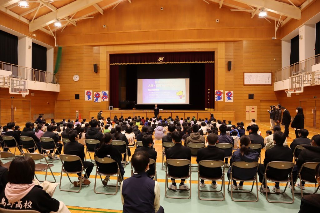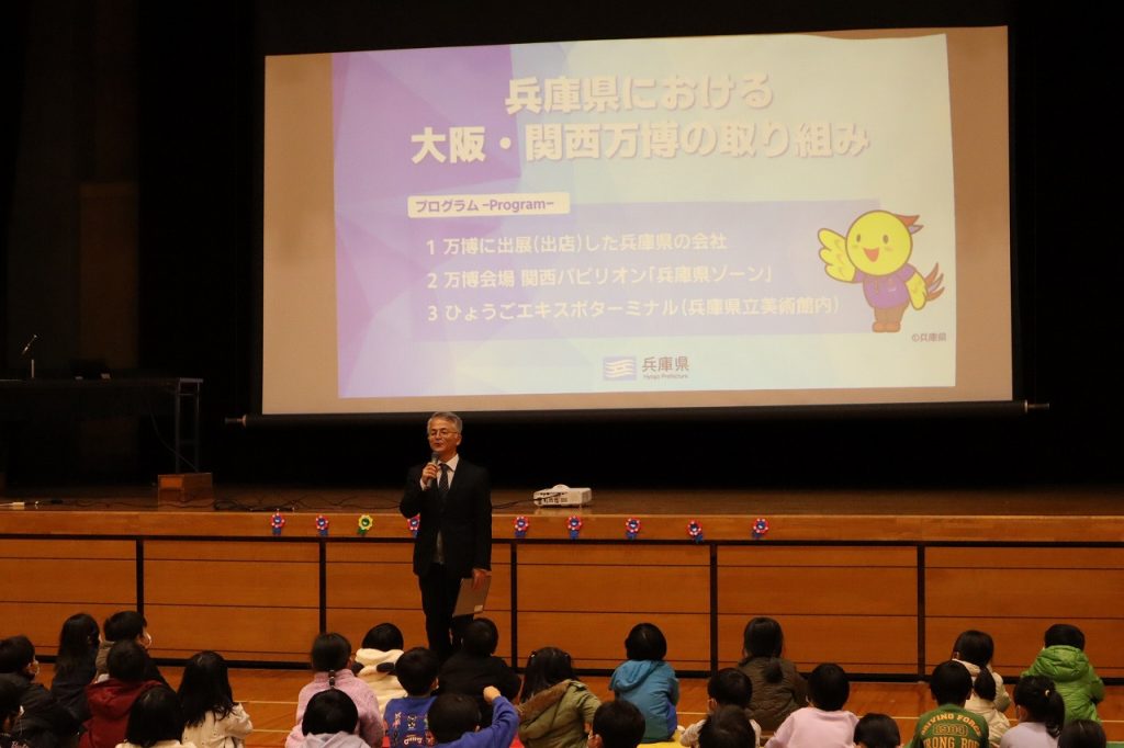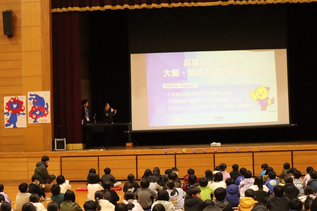 関宮学園に関西万博が来たというテーマで、兵庫県庁職員の馬場崎さんと安達さんに来ていただき、関西万博の概要や兵庫県のパビリオンの講演をしていただきました。関宮こども園、関宮学園前期後期の園児児童生徒が一斉に講演を聴きました。万博に行けてない子どもたちも多く、万博の雰囲気を味わえたり、兵庫県が世界に発信している内容を教えてもらったりするなどとても興味深い講演でした。
