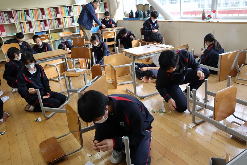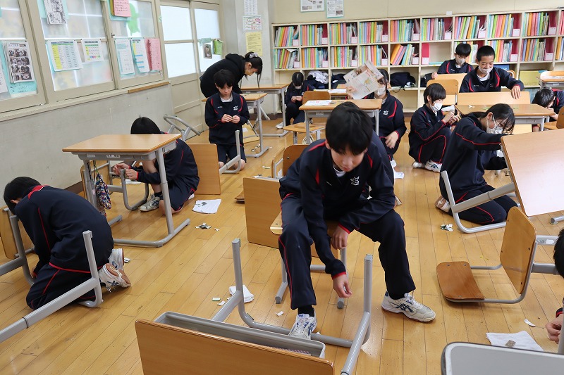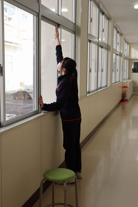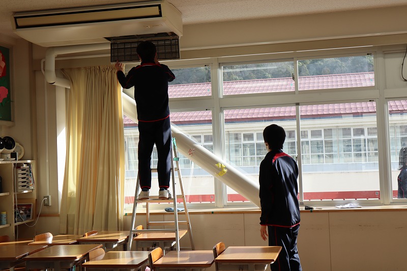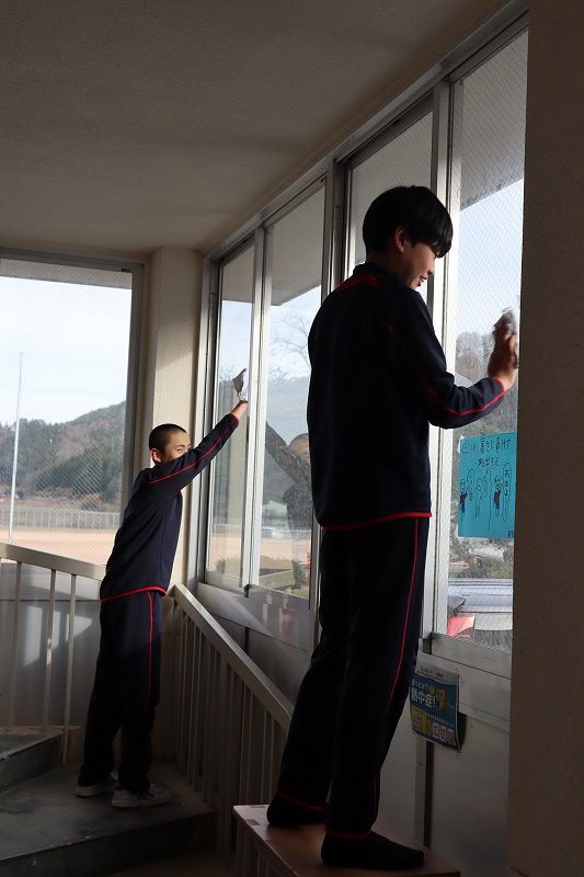 全校生で大掃除をしました。まずクラスの机や椅子についているゴミや埃を取りました。次に、校舎のガラス拭きをしました。毎日掃除をしている場所も、エアコンのフィルターや換気扇などを掃除することができました。全てのことに全力で取り組む関宮学園の伝統が見られた一日になりました。心も体もピッカピカです。