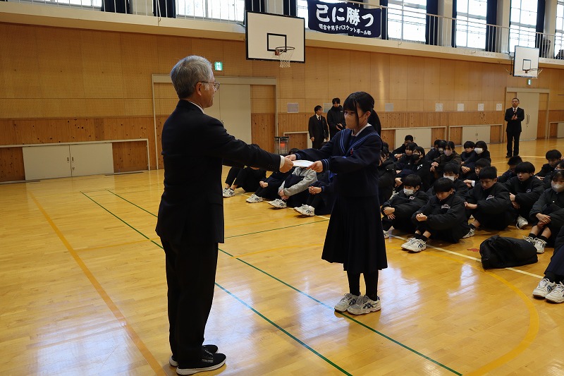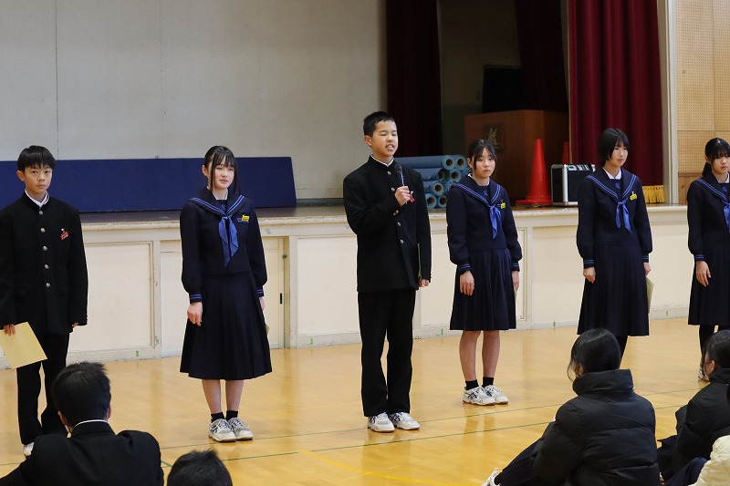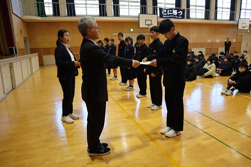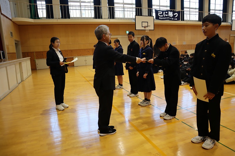 本日は3学期始業式を行いました。前期・後期の校歌を元気よく歌うことができました。校長先生からは、愛情や願いをもって植物を育てるように、自分自身を「なりたい自分」に育ててみようというお話がありました。児童生徒は今年も頑張るぞというきりっとした表情で始業式を迎えていました。後期課程では、新生徒会の認証式が行われました。校長先生から生徒会執行部に認証状が渡された後、一人ずつ所信表明を行いました。関宮学園の伝統を引き継ぎ、更により良い学校にしてくれるように感じました。次に、12月27日に開催されたアンサンブルコンテスト但馬地区大会の表彰伝達を行いました。