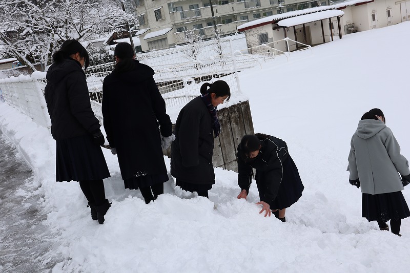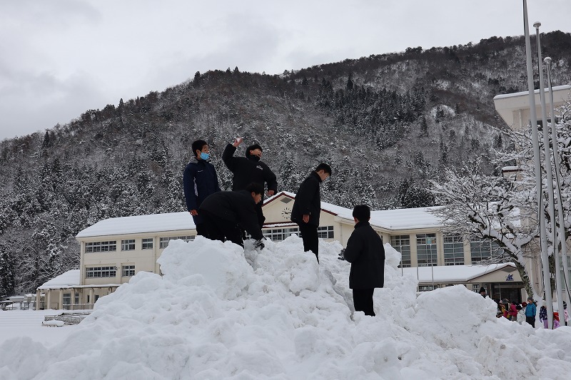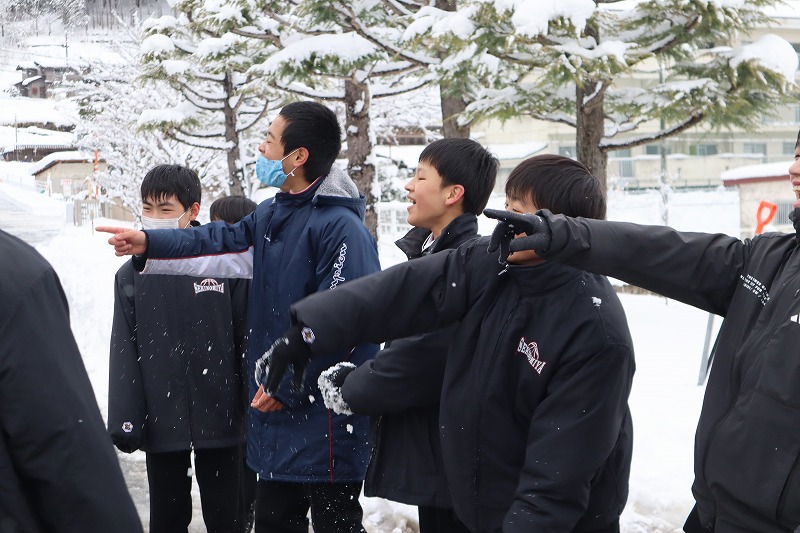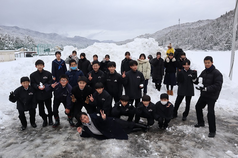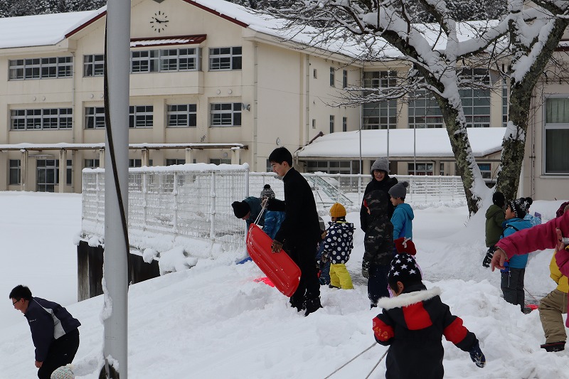 週末から雪が降り積もり、関宮学園の敷地内にたくさんの除雪後の雪が積み上がっています。前期課程やこども園の児童や園児が歓声を上げながら元気に雪遊びをしています。今日は後期課程7年生も、雪で楽しみました。こども園と一緒にそり遊びをしたり、雪合戦をしたり、各々が身体を動かしました。