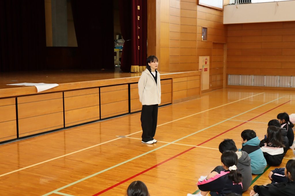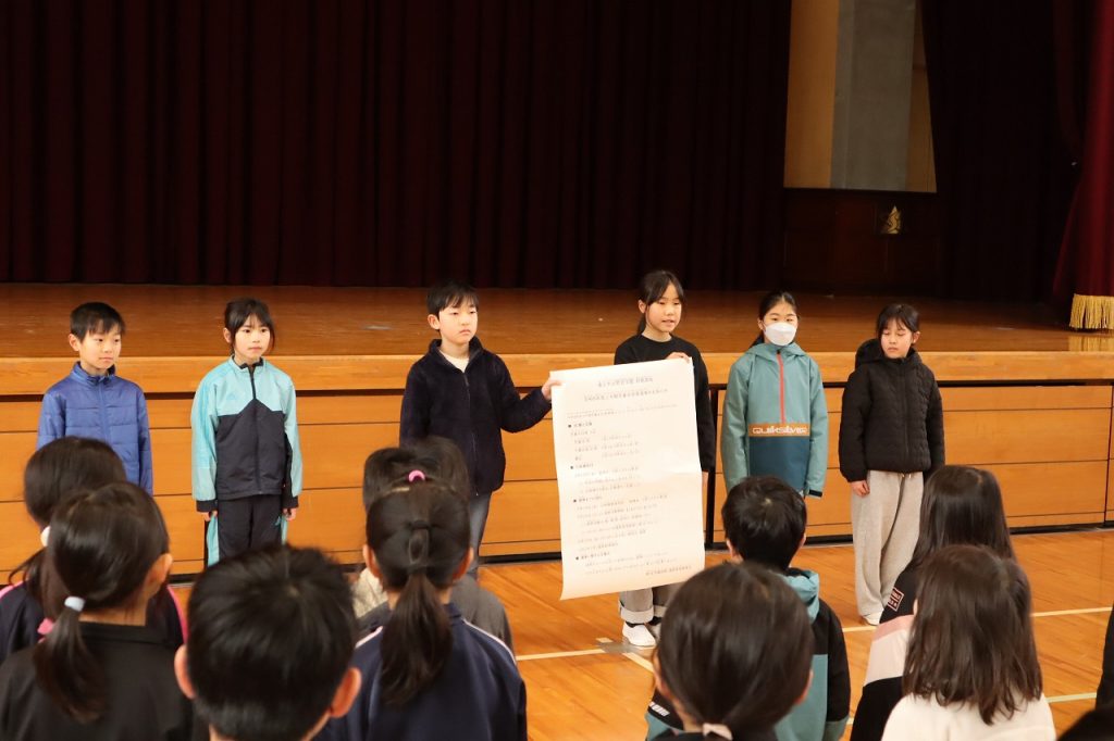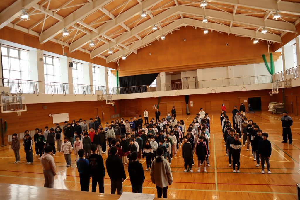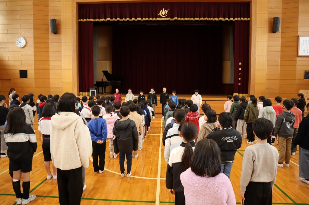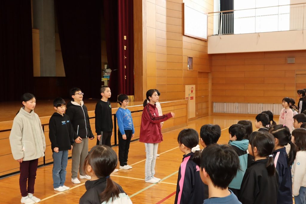 今日の音楽朝会は、1月の歌「しあわせ運べるように」を歌いました。この歌は阪神淡路大震災が起きたときにできた曲で「復興と希望の歌」と言われています。みんな気持ちを込めて歌い、体育館に歌声が響きわたりました。その後は、選挙管理委員会から令和8年度の児童会選挙の公示の連絡がありました。
