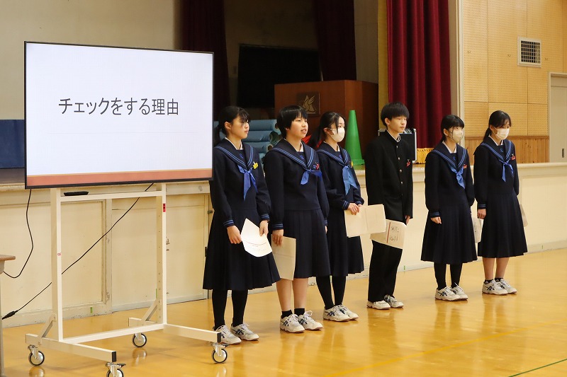今日の生徒集会は、女子バスケットボール部のウィンターカップ優勝の表彰と、各専門部からの連絡、衛生部からの発表がありました。衛生部は、ヘルスチェックをする理由についてわかりやすく説明し、爪のチェックの仕方などを詳しく話しました。自分でも健康管理ができるように毎日チェックしましょう。