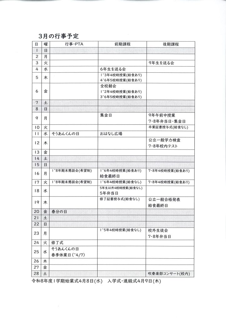 令和7年度 3月行事予定