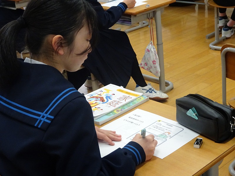 8年生の家庭科の授業では、消費生活について学びます。将来は自分で収入を得て、家計を管理する立場にもなるので、買い物をする中で必要なものと欲しいものを区別する力や、お金を計画的に使う力(予算管理)、物やサービスの価値を見極める力を育て、自立した生活に向けて基礎をつくります。今日は養父市消費生活センターの方をお招きし、消費生活について講義をしてもらいました。主にインターネットを通した現代の消費生活トラブルに遭わないために、色々な事例を元に紹介してもらいました。自分の生活に関わることですので、熱心に聞いていました。