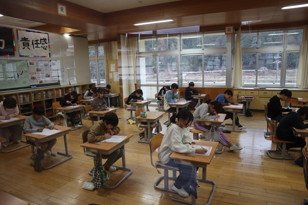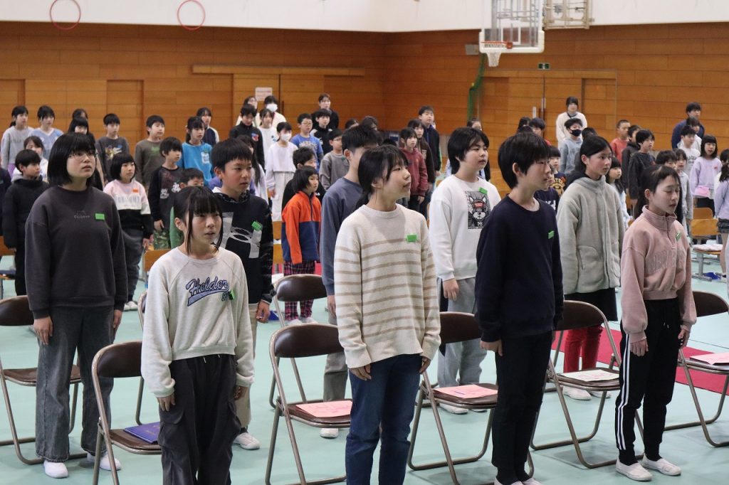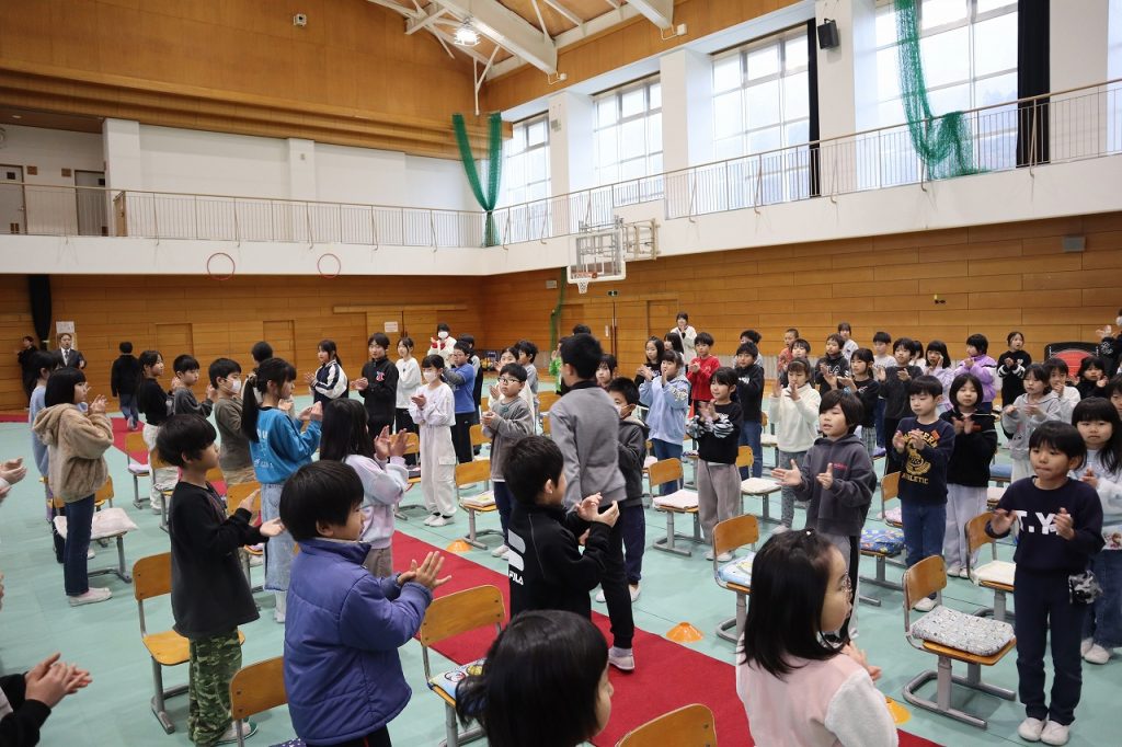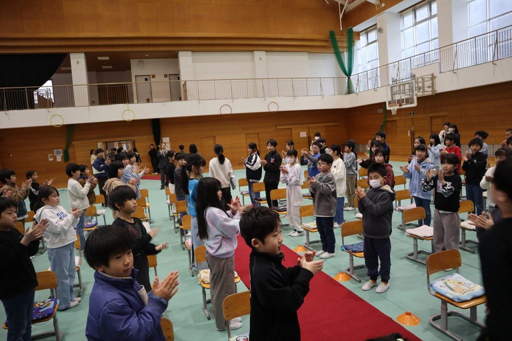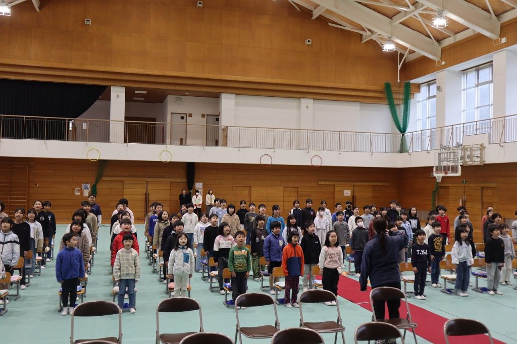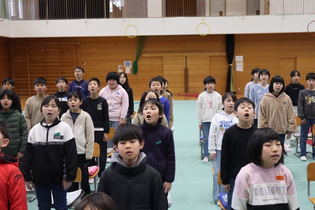 今朝は校舎がうっすら雪化粧をしていて、日中も雪が降ったりやんだりの1日でした。朝は今年度最後の全校集会をしました。3校時は修了式練習で立ったり座ったりする練習や歌練習をしました。姿勢良く座れるようになったり勢いよく立てるようにもなりました。歌練習では口を大きく開け昨日の歌声より更に大きな声で歌いました。4年生では育休に入られた先生が学校に来られ5年生に向けて激励のあいさつをされました。子どもたちは久しぶりの再会でとても嬉しそうにしていて、5年生に向けて気持ちを引き締め直しました。寒い一日でしたが全校生が次の学年に向けてしっかり過ごすことができました。