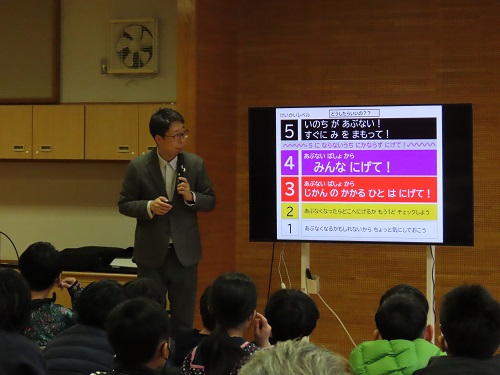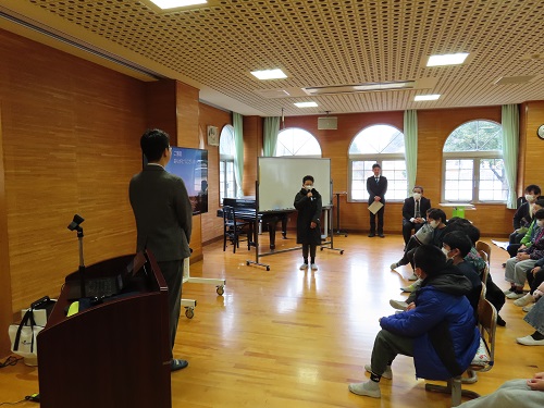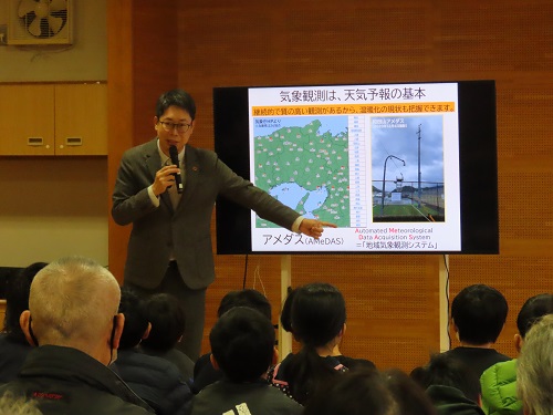 気象災害モデル校の事業として、気象予報士の片平 敦さんに来校いただき、「地球温暖化に伴う気象の変化と災害の備えについて」をテーマに講演いただきました。地球温暖化が進むと、気温の変化以外にどんなことが起こるのか、地球温暖化により災害が起こった場合どんな行動をとれば良いか、また事前に対策できることはあるかなど、気象災害について色々なお話を聞くことができました。