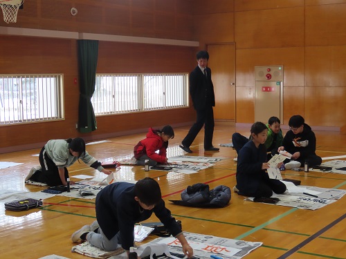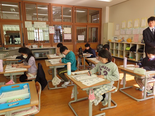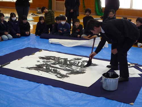 谷川玄龍先生にお越しいただき全校生で書き初め会を行いました。始めに谷川先生の模範演技をみせていただました。今年は、地に足着けて高く飛び上がってほしいという思いから、「騰」の字を書いていただきました。その後、1・2年生は硬筆、3~4年生は毛筆で今年1年の抱負を書き上げました。最後に書き上げた作品と共にそれにこめた思いを1人ずつ発表しました。