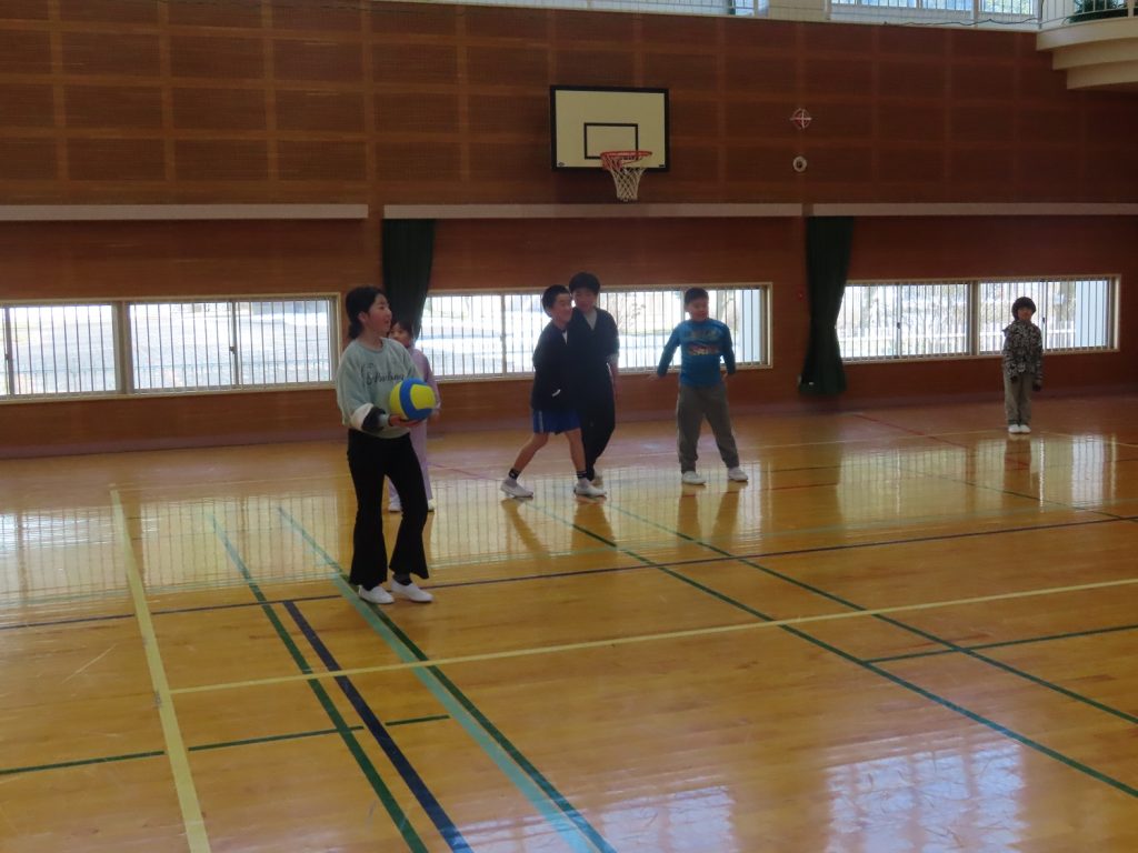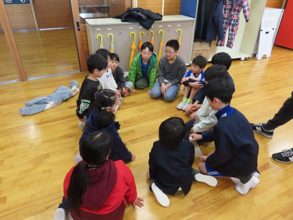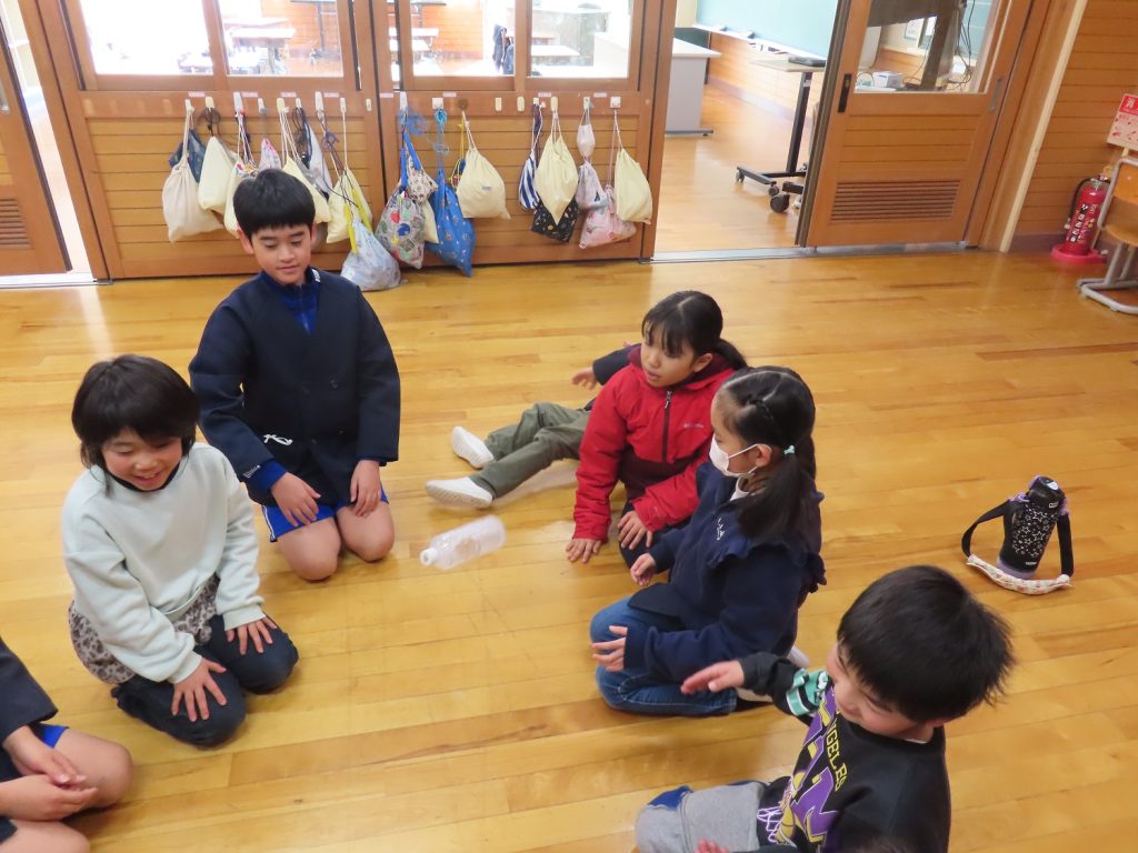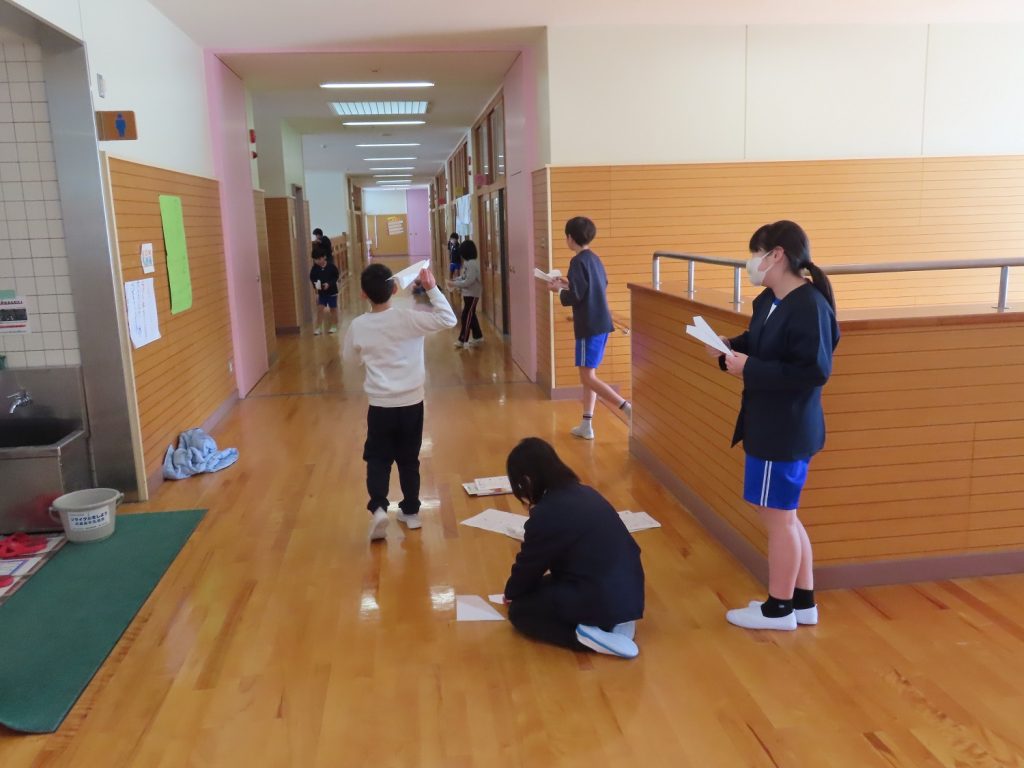 2月4日のLongたきのやタイムは、縦割り遊びをしました。各班で「みんなで仲良く遊ぶ、協力して遊ぶ、楽しく安全に遊ぶ、ゆずりあいはげましあいながら遊ぶ」と、めあてを決め、紙飛行機大会、ボトルフリップ、ボール投げゲーム、王様ドッジボールをしました。