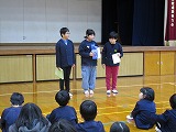 図書委員会から各学年へ「お年玉本」が送られました。新春ですね。「お年玉本」の封筒の中には、図書委員おすすめの図書が3冊入っているそうです。嬉しい活動です。おすすめの図書にたっぷり親しんでください。また、児童会から「一発芸大会」の応募案内がありました。1月27日開催予定です。ステージ上で輝く、たくさんのやぶっ子を見たいです。