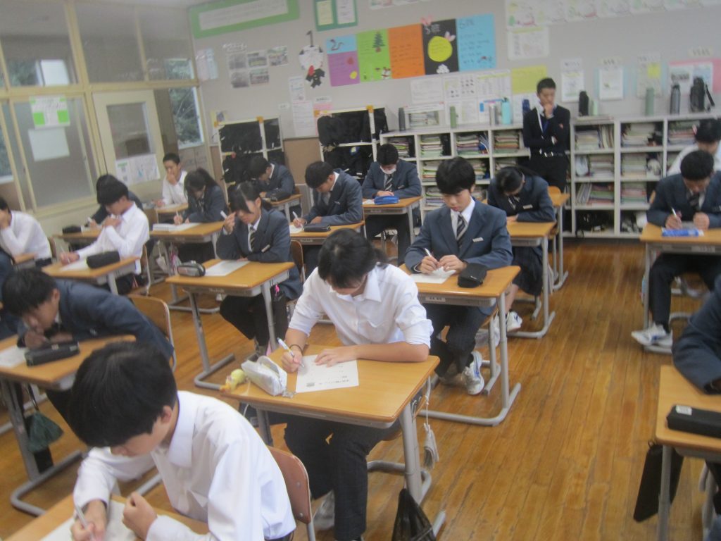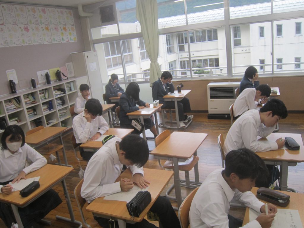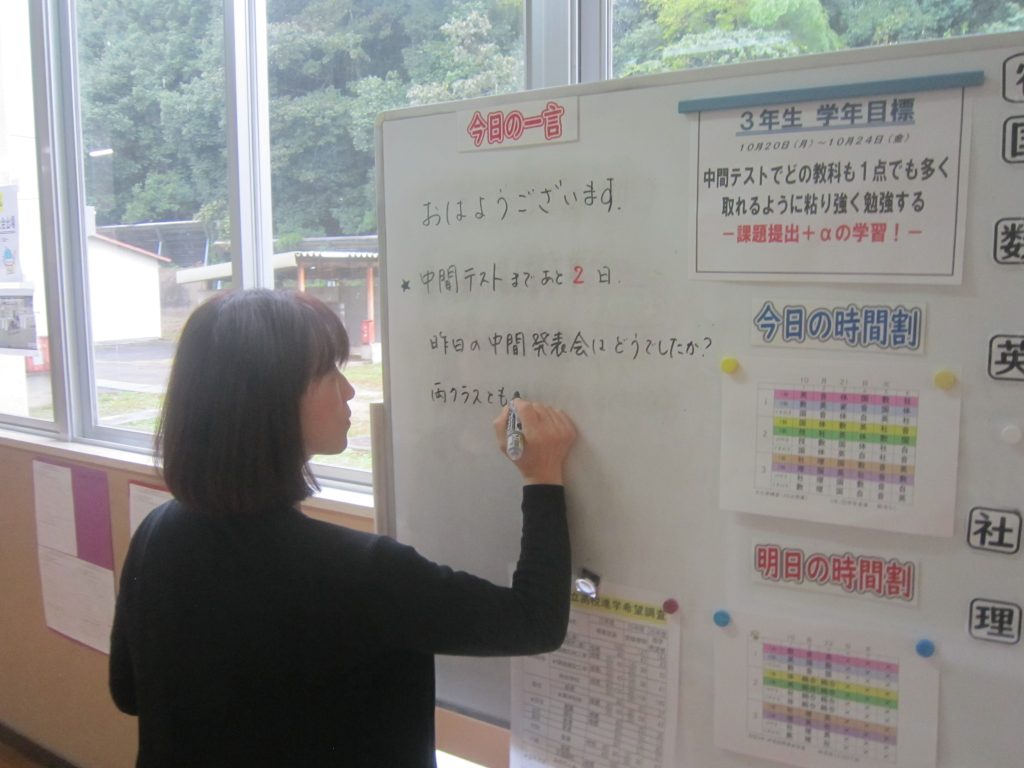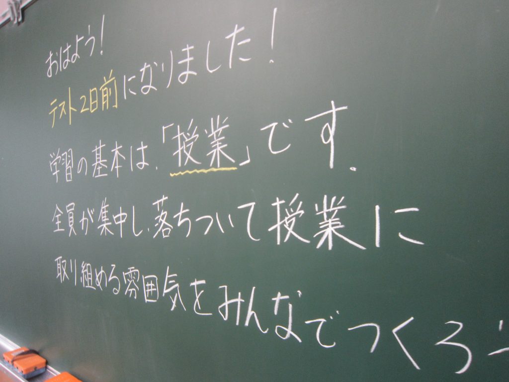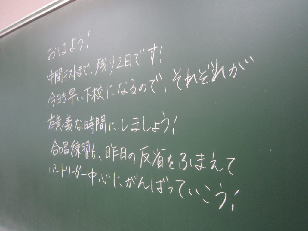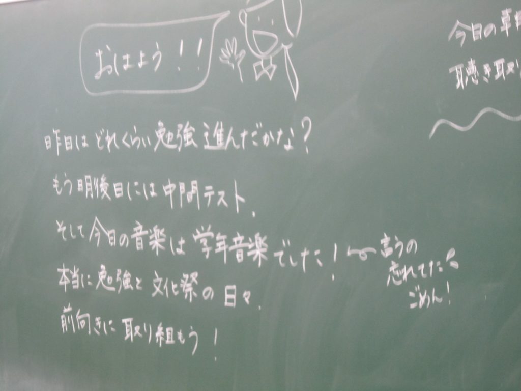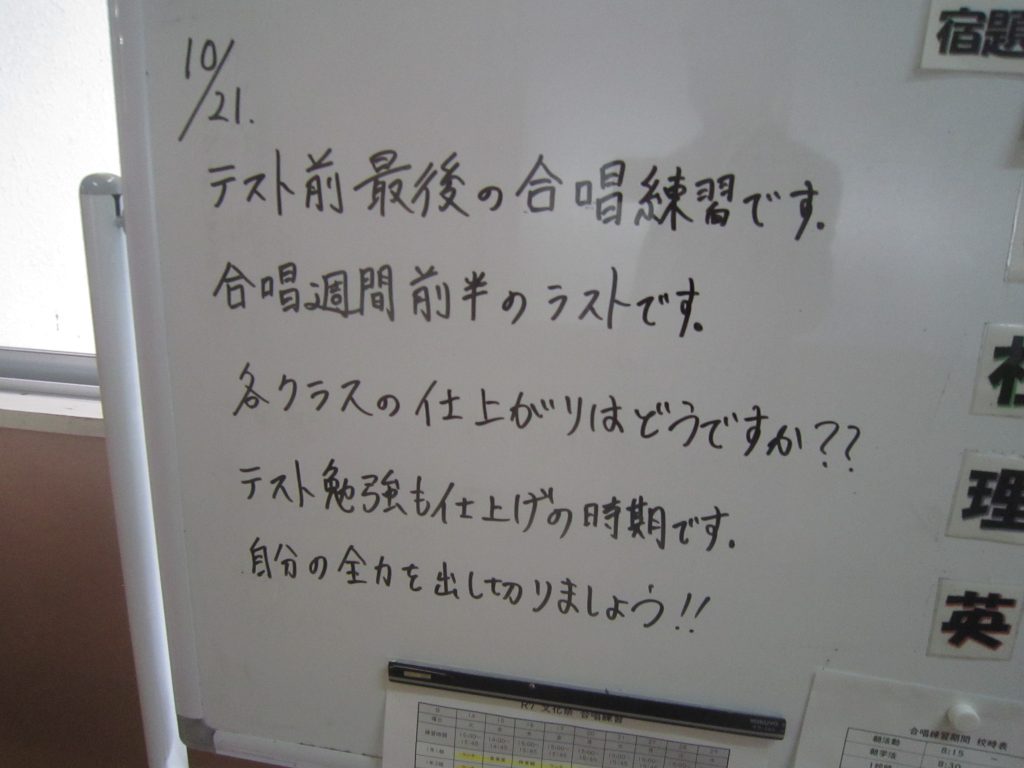 ただいま文化祭週間中ですが、今週末には中間テストも控えています。よって、今朝の各学級の黒板や各学年フロアのホワイトボードには担任や学年職員からの多様なメッセージがしたためられていました。中間テストに向けた学習意欲の喚起を促すもの、文化祭合唱に向けたさらなる奮起を促すもの、日々の授業の大切さを訴えるもの・・・。数々のメッセージには各教師の熱い願いが込められています。生徒たちにはその熱い願いに応えて頑張ってほしいと期待しています。そのような中、朝活動で「全校聴くトレ」が行われました。写真は放送に必死に耳を傾ける生徒の様子です。