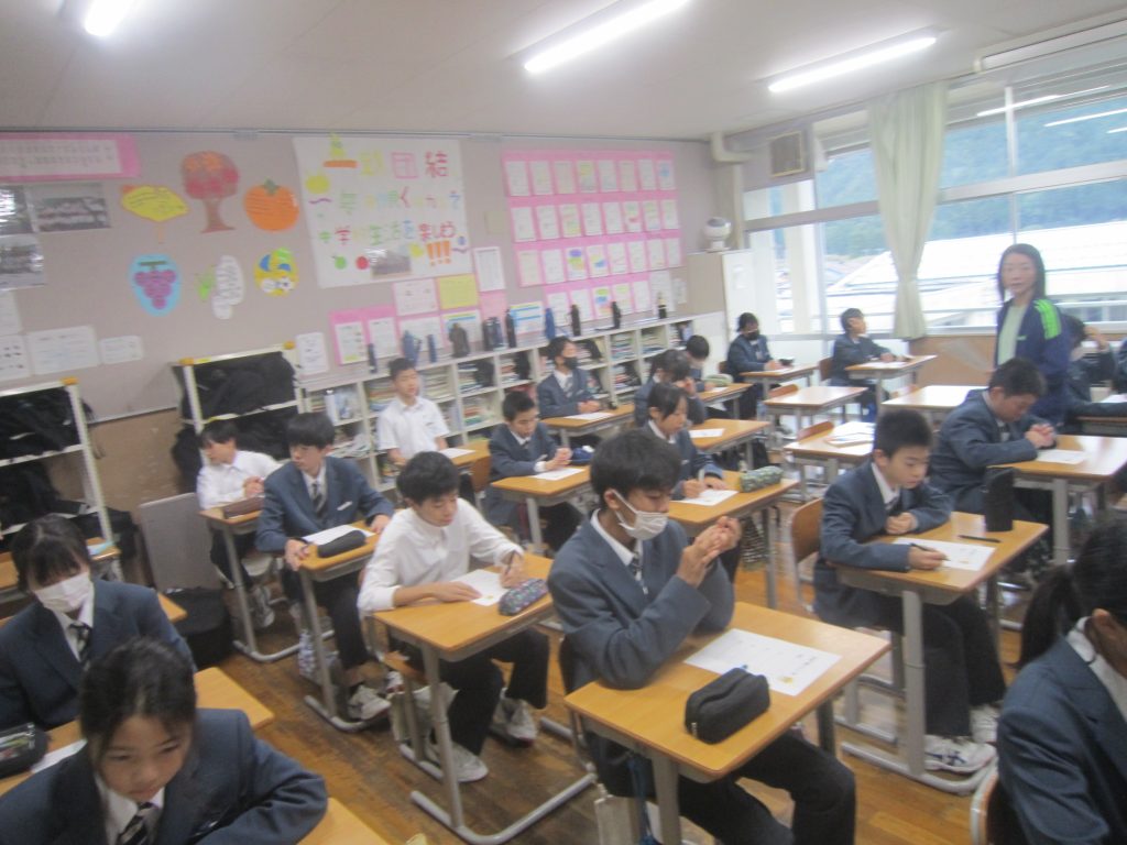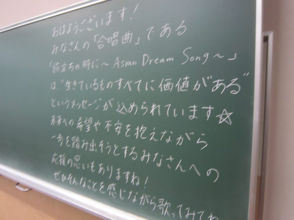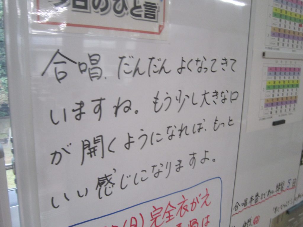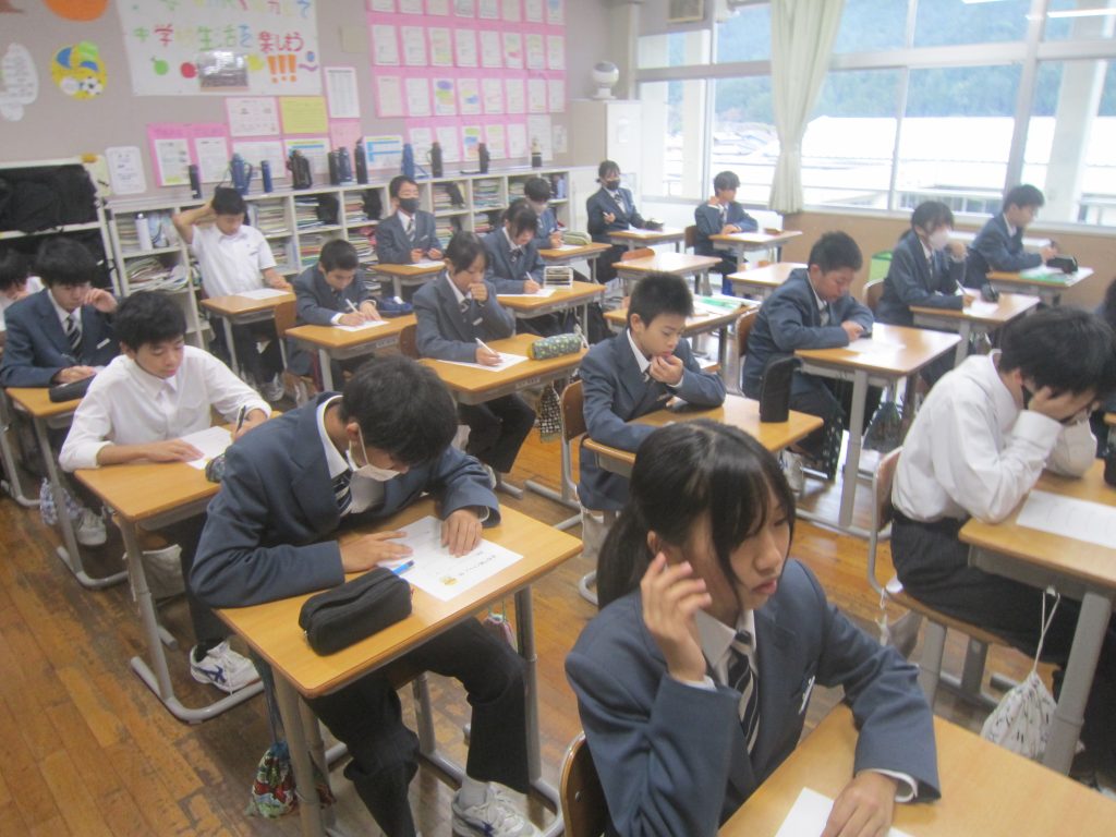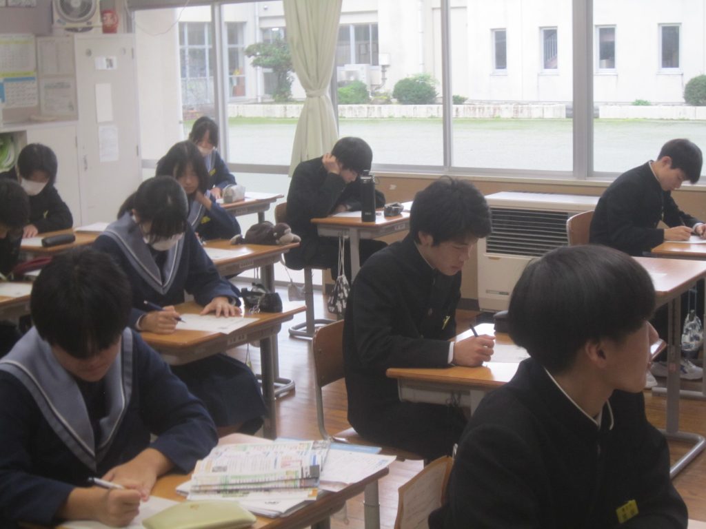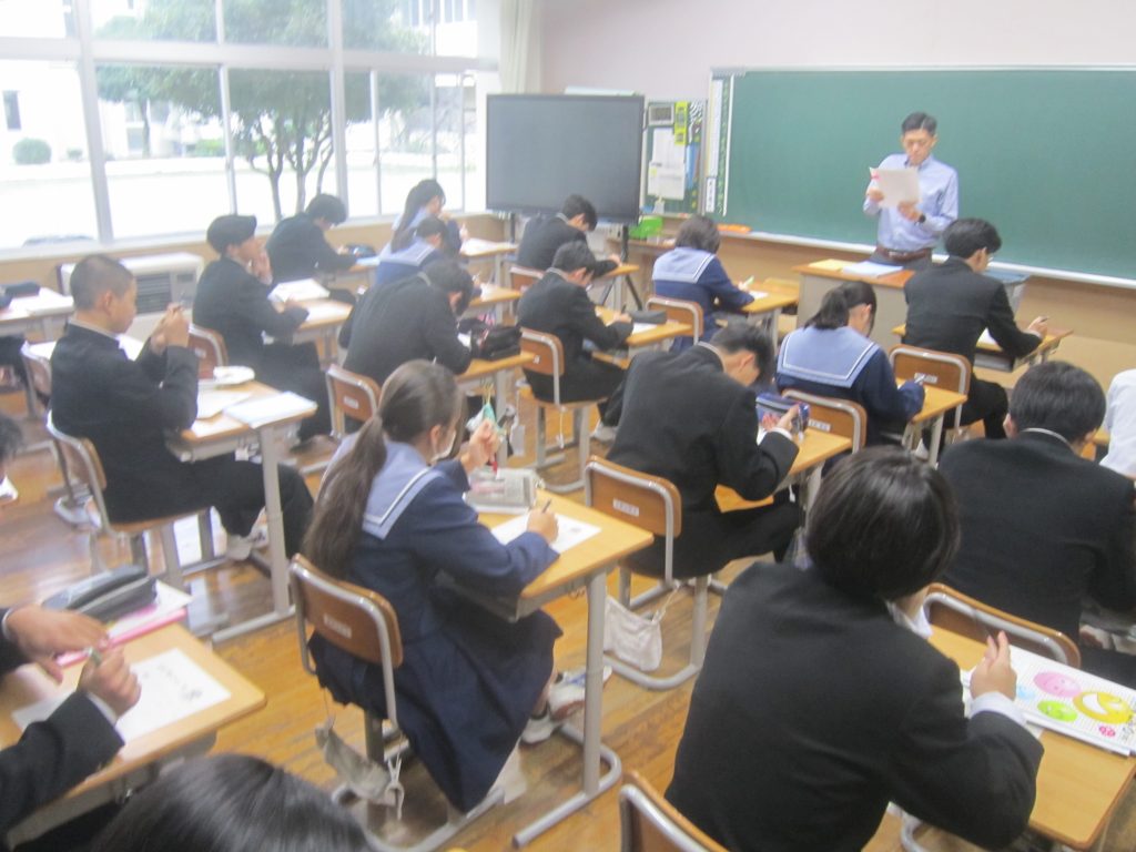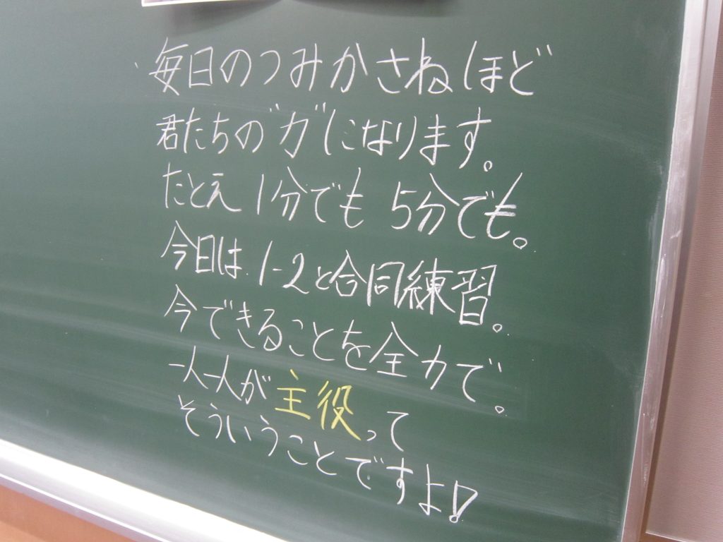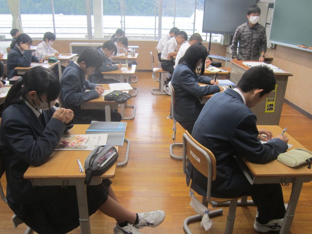 ただいま文化祭週間中ですが、今週末には中間テストも控えています。よって、今朝の各学級の黒板や各学年フロアのホワイトボードには担任や学年職員からの多様なメッセージがしたためられていました。中間テストに向けた学習意欲の喚起を促すもの、文化祭合唱に向けたさらなる奮起を促すもの、日々の授業の大切さを訴えるもの・・・。数々のメッセージには各教師の熱い願いが込められています。生徒たちにはその熱い願いに応えて頑張ってほしいと期待しています。そのような中、朝活動で「全校聴くトレ」が行われました。写真は放送に必死に耳を傾ける生徒の様子です。