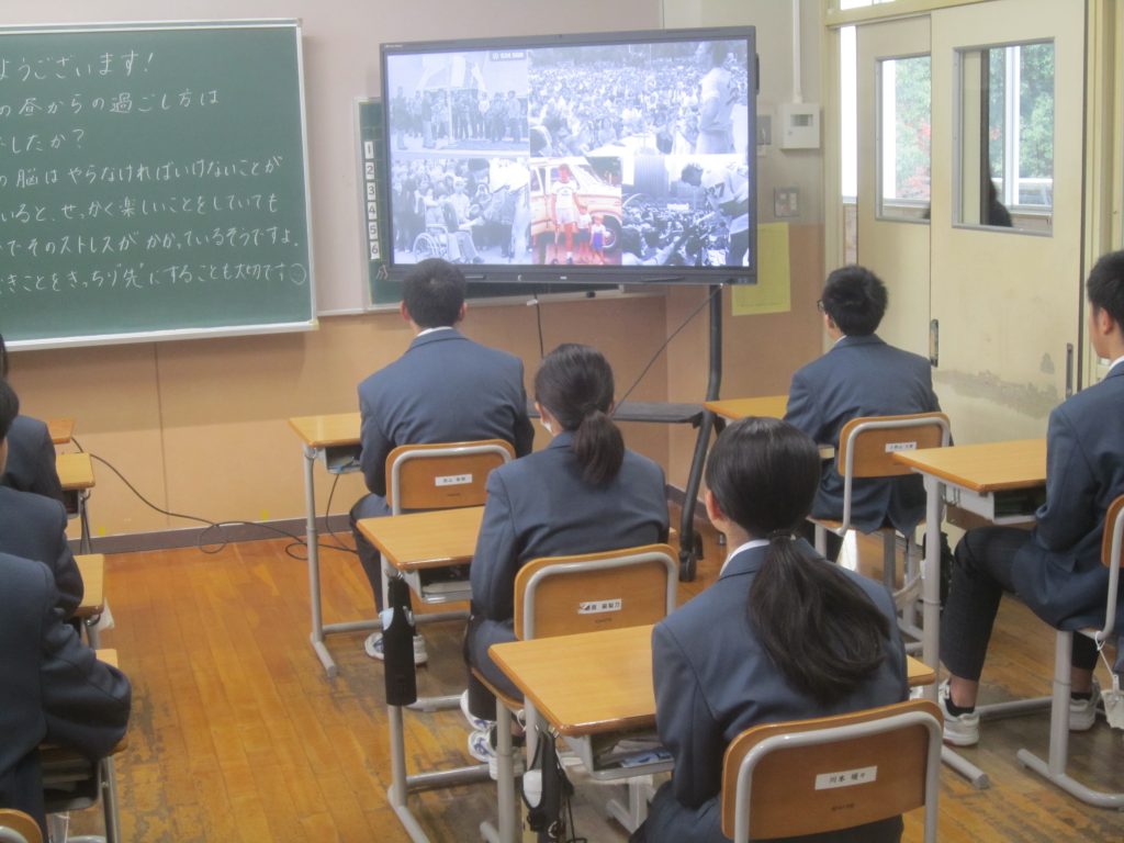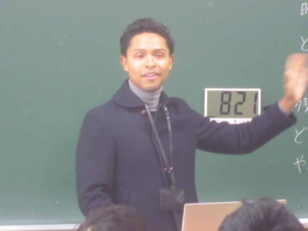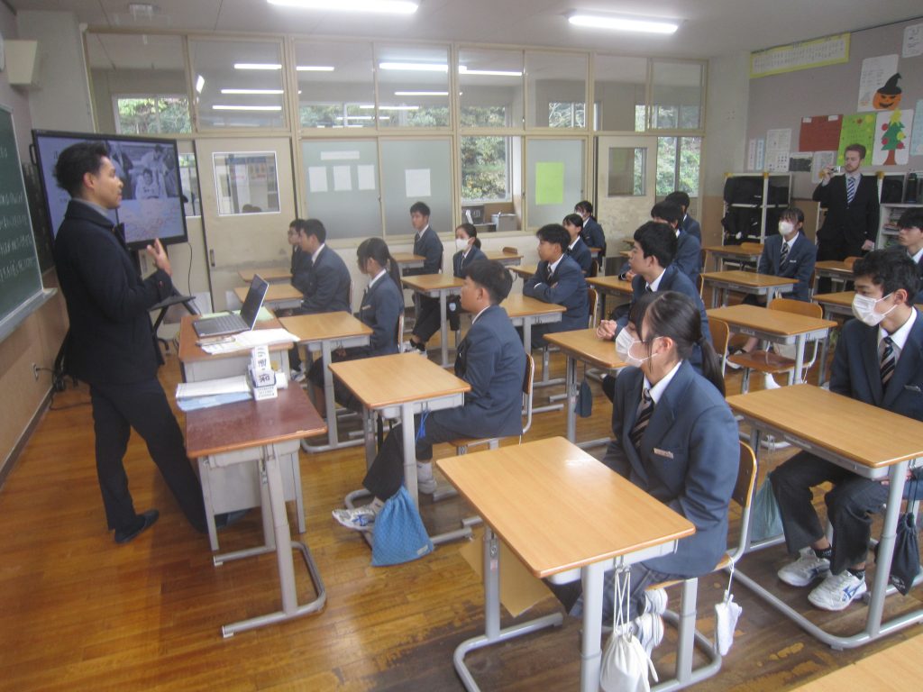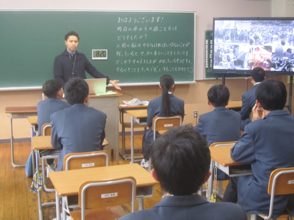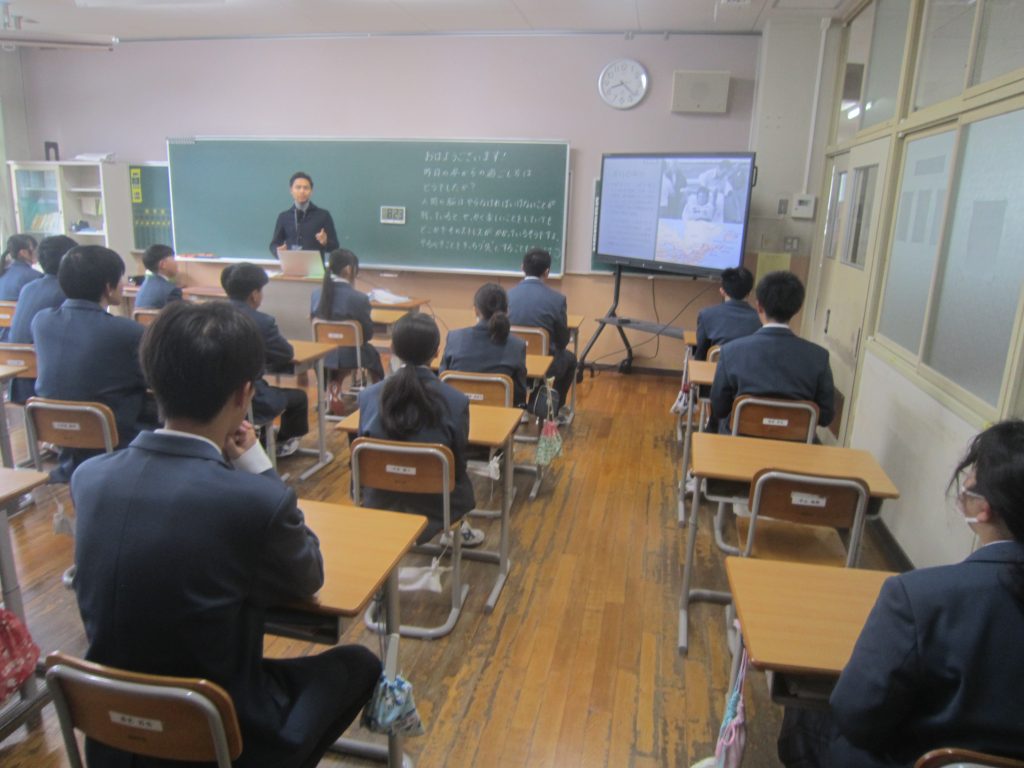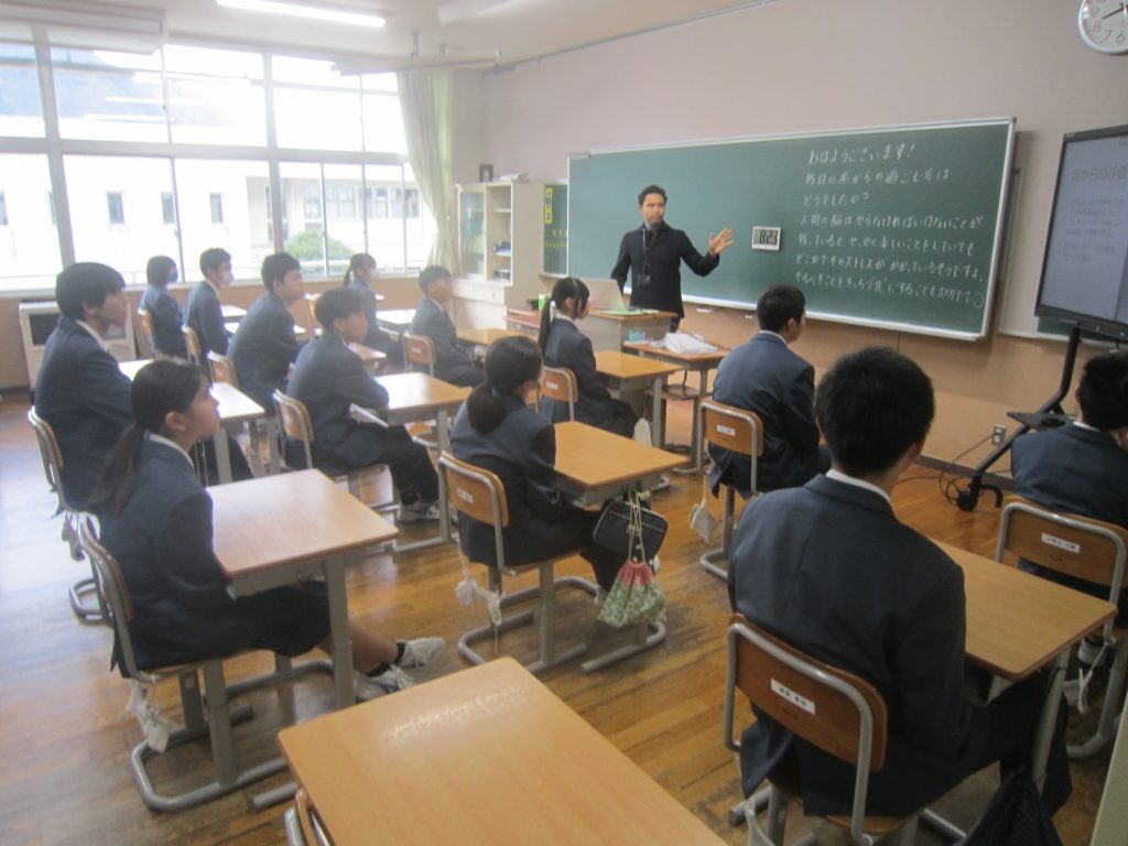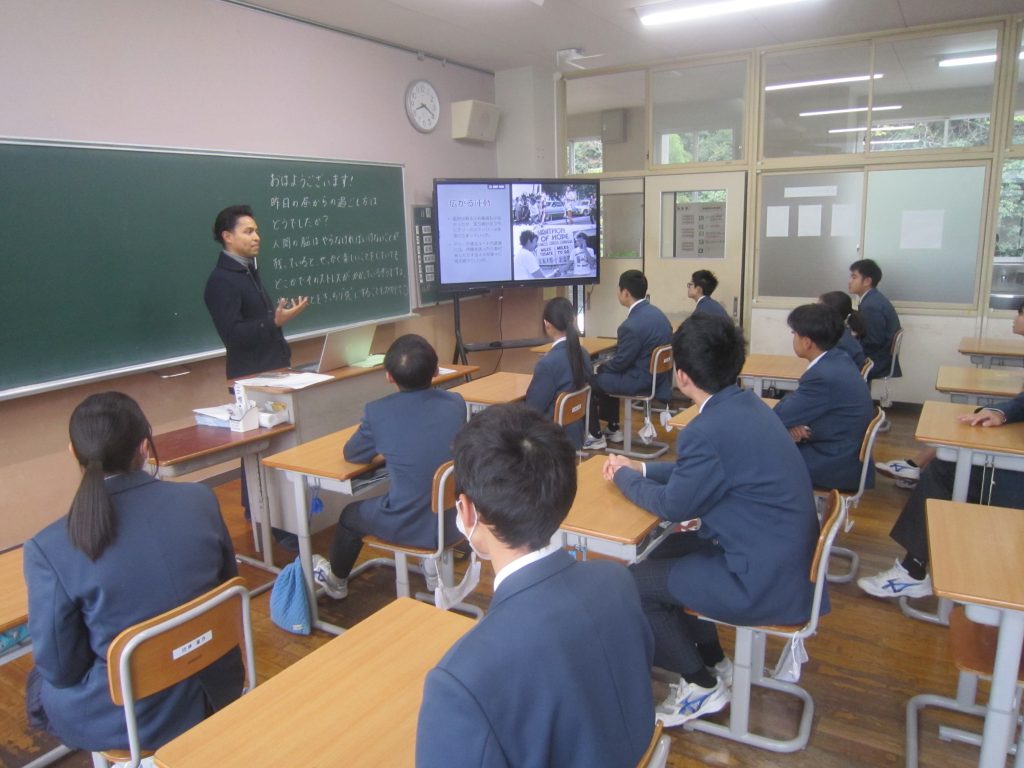 11月13日(木)、2年1組で、養父市国際交流員であるセサルさんに、「希望と勇気のカナダヒーロー」というテーマで異文化交流講話をしていただきました。これは、10月に3年生を対象にしていただいたお話であり、カナダの義足マラソンアスリートであるテリーフォックス氏が、がんのために右足を切断し、がん研究資金を募るため、「希望のマラソン」を開始した物語です。その功績に対してテリーフォックス氏は史上最年少でカナダ勲章を受賞したとのことで、生徒たちは物音ひとつ立てずにセサルさんの話を聴いていました。