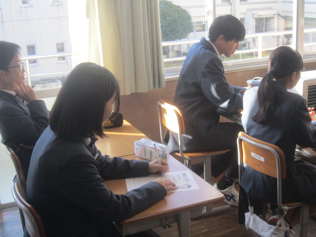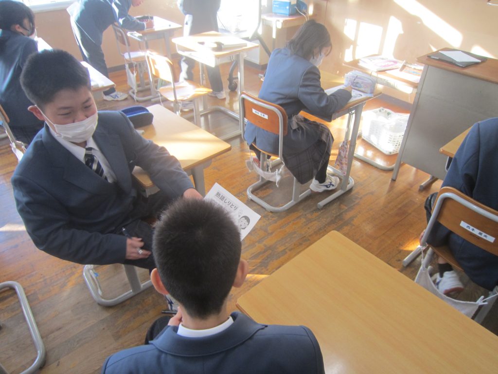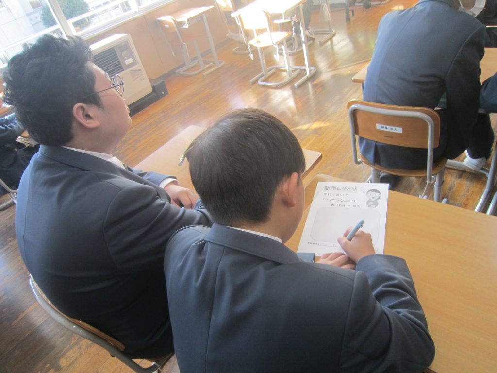11月17日(月)の朝活動で「熟語しりとり」を行いましたが、12月1日(月)はその第2弾がありました。今回のお題は、「解放」「始動」「出発」であり、その中から一つ選び、ペアで熟語の最後の文字を使って3分間でしりとりを続けるというルールです。各クラスで懸命にしりとりを続けようとする生徒の姿に出会いました。基本的な国語力を高めていく大切な活動と捉えて、今後も継続して行う予定にしています。それにしても、時の流れは早いもので、今日から12月、つまり「師走」です。2学期の締めくくりの時期に入りました。